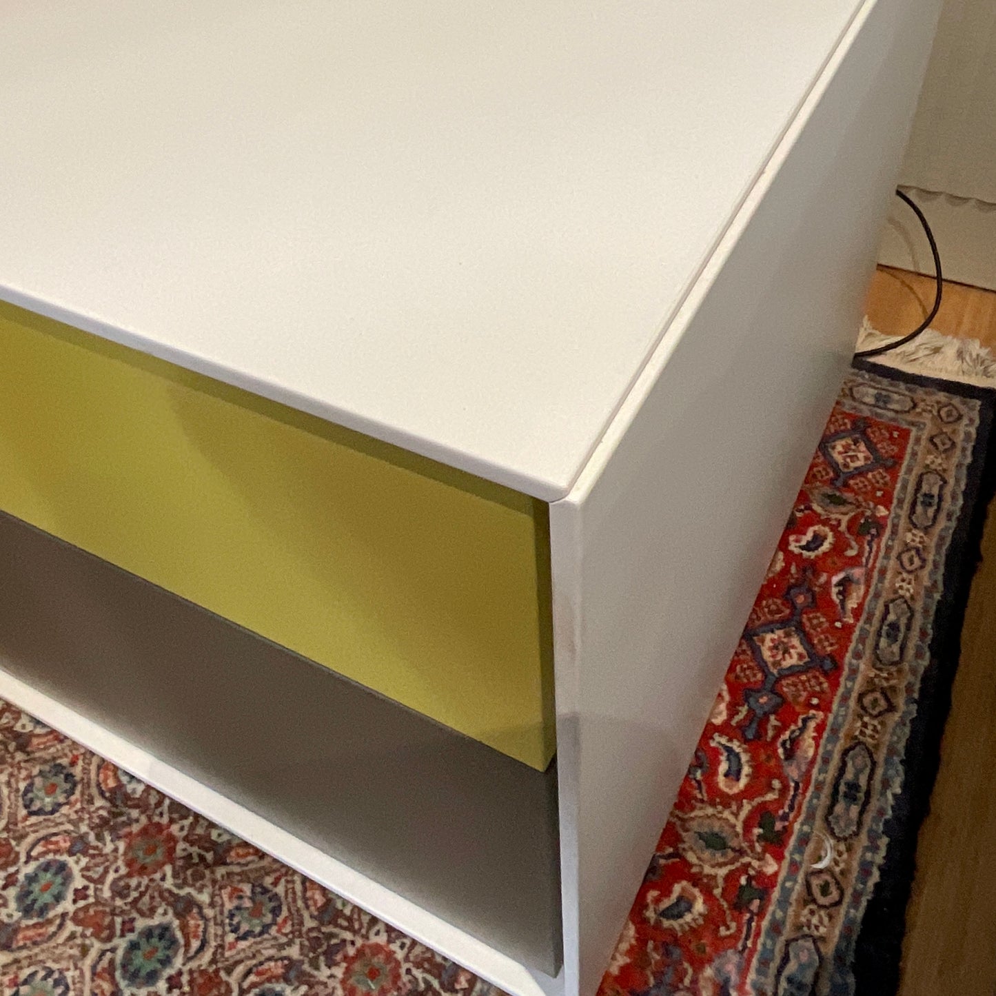 A large family of storage units enhanced by chromatic variations and plays of bright and matt finishes, while maintaining the formal rigour of the design. They are customised by an important detail: the greater depth of the tops and sides, as compared to the drawers, that contribute a sense of depth to the front. The drawer unit we have on offer has a frame in Satin white with two drawers in green and brown.