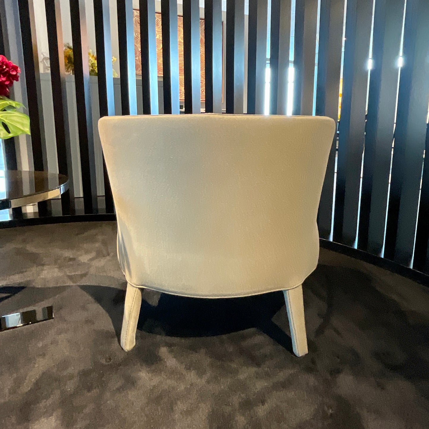 Febo is a family of sofas and armchairs that carries with it the memory of a traditional design distinguished by a large enveloping back without armrests. The sofas come in two sizes: a smaller one with low or high seat cushion and a larger one. The chair we have on offer is in a low back upholstered in a neutral fabric.