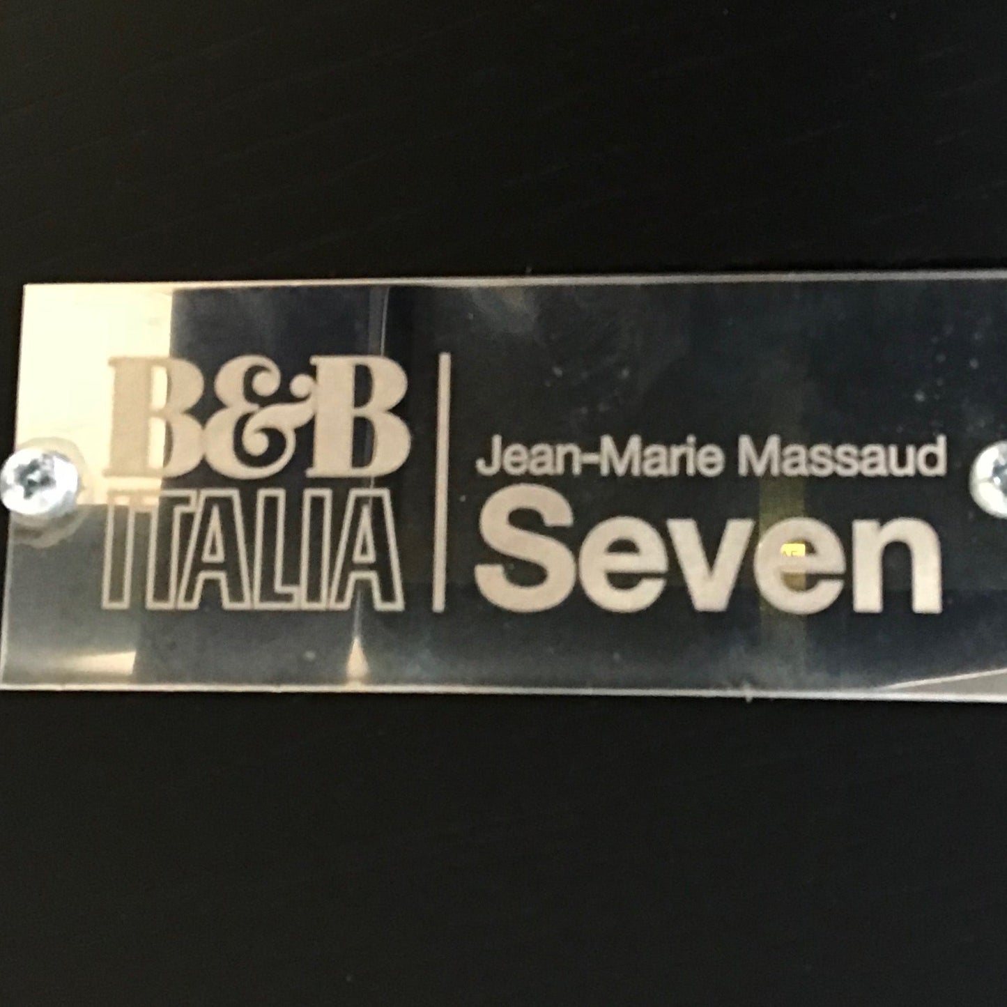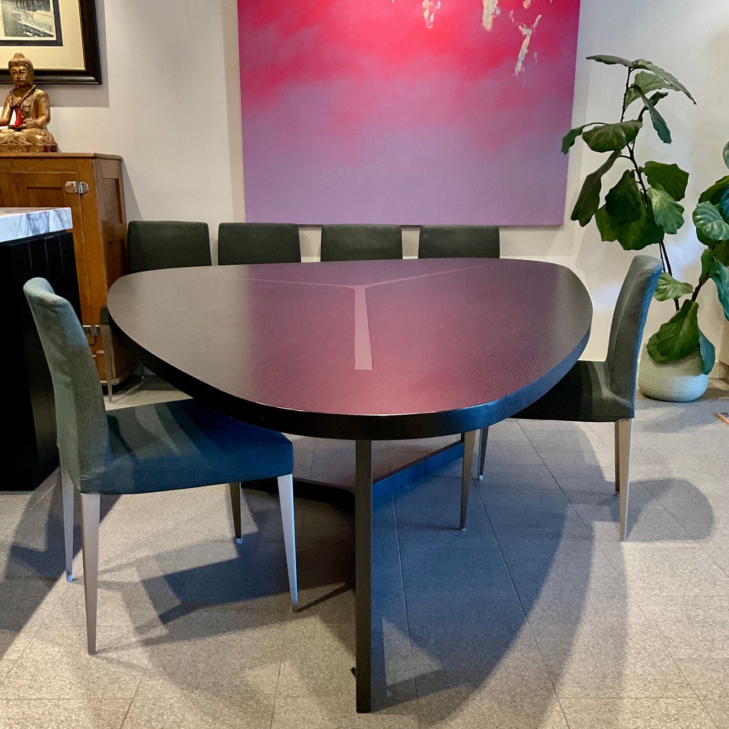 The iconic Seven Table, designed by Jean-Marie Massaud for B&B Italia, is characterised by its three-sided form. A graphic object designed to seat seven. Characterized by the particular shape of its top, with three different sides, Seven is able to accommodate seven people or, as its designer likes to say, 6+1. 3+2+2 chairs should be placed on each one of its sides. The Seven sign makes it so strongly recognisable that it changes the layout of space and modifies perception. The three-branch design of the picture resurfaces from the top, creating a graphic decoration in contrast or chromatically harmonic. The whole metal structure is varnished. The table we have on offer has a slate black painted base with a smoked oak top and a satin anthracite base.