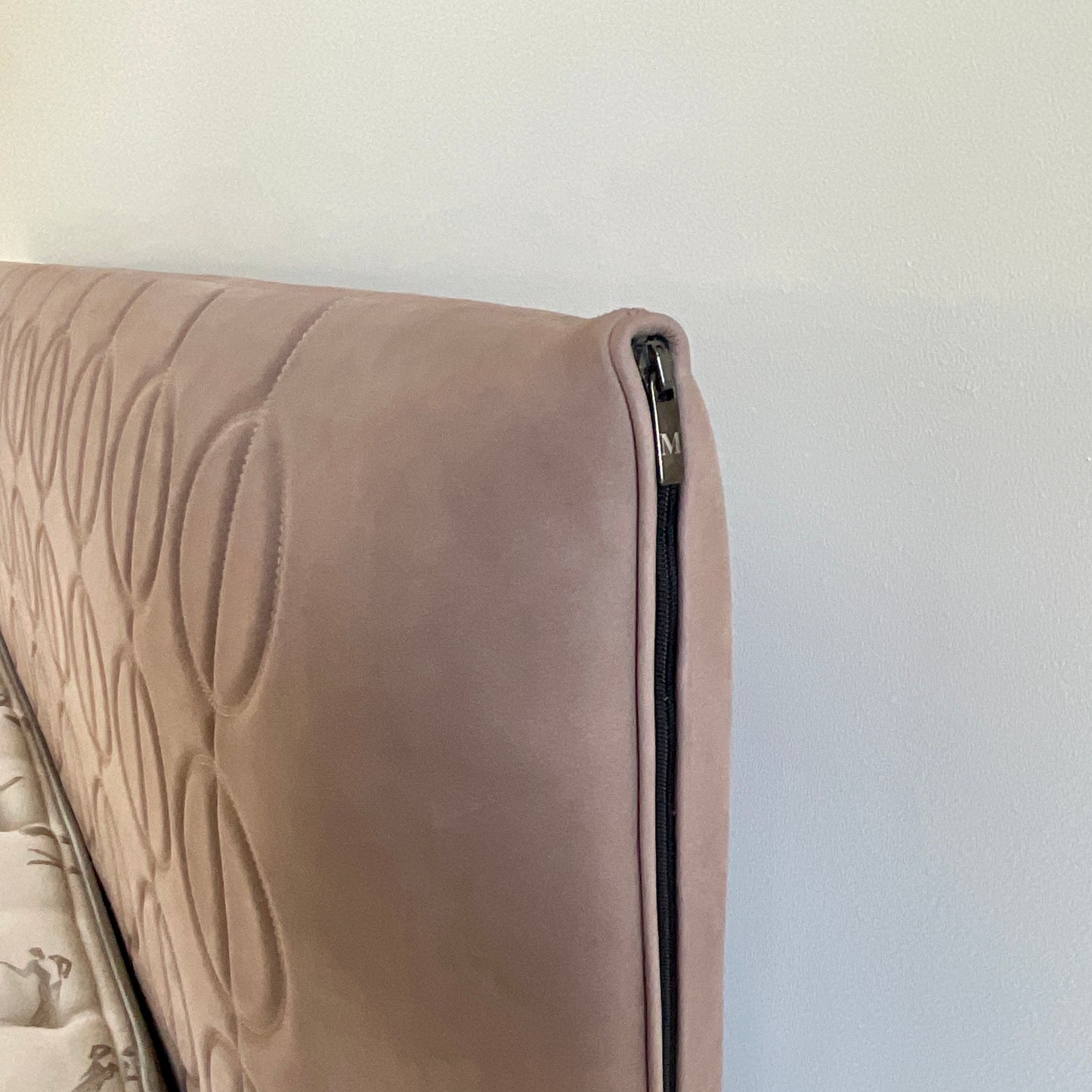 The workmanship conveys an effect of great softness to the fabrics and the leathers used for the upholstery. The pattern, simplified and reduced to the sole vertical line, is also the protagonist of the finishing of the sommier raised from the ground.