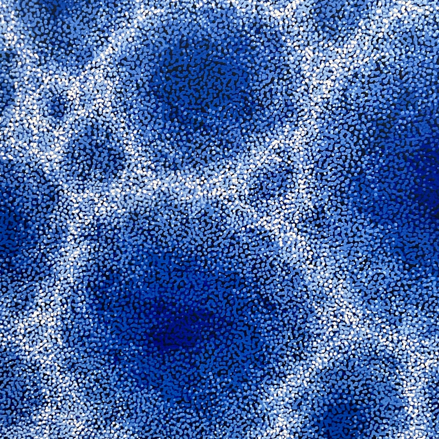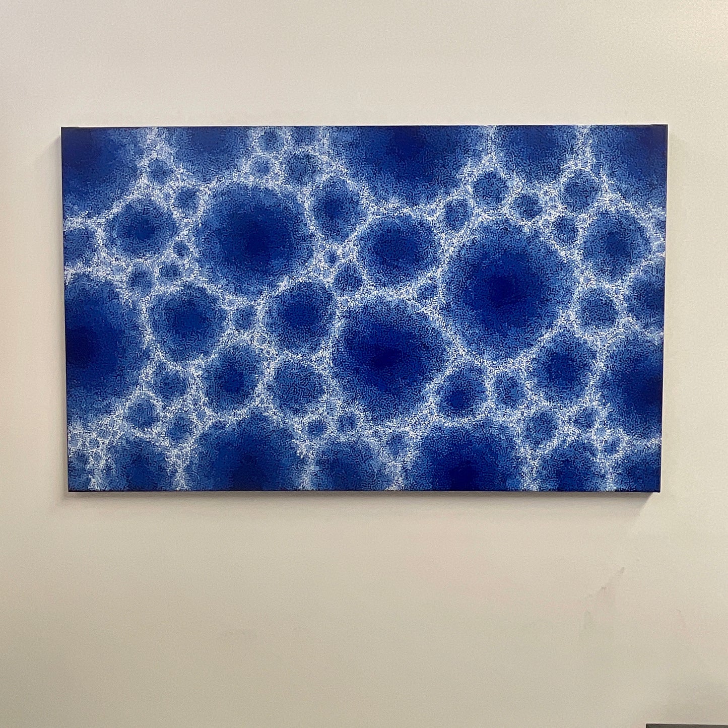 Like her father, Tarisse paints a Water series. Technically, Tarisse captures the movement and shimmer of the water as seen from above through her varied tonal use of blues and whites. She paints aquatic peaks and troughs employing a condensation of dots to create the peaks and sparseness of dots to reveal the black canvas below and represent the deep black waters and the shadows lurking underneath. They form such an optical effect the canvas appears to move, and it is difficult to find a single focus point for long. The depth of the Water paintings and their rejuvenating qualities can be felt, luring the viewer to Tarisse's work.