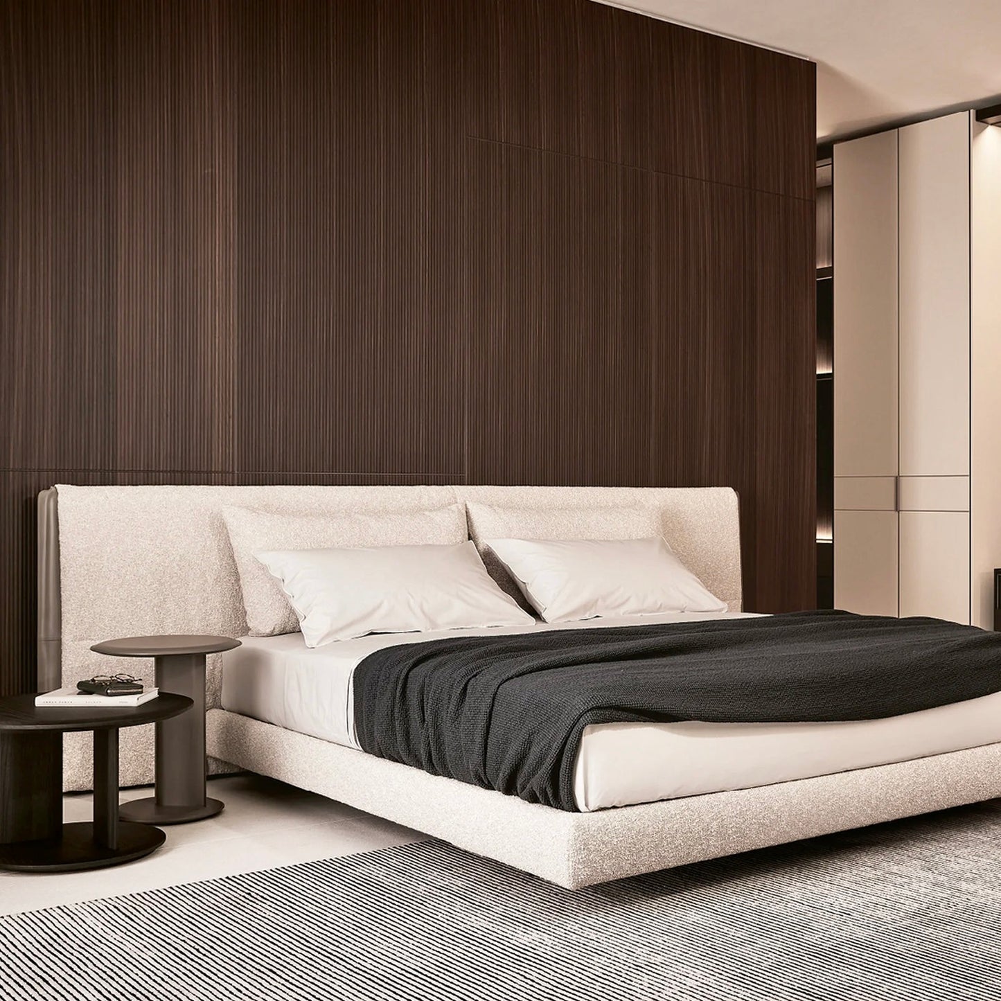 Yume is an upholstered bed that reinterprets a classic design through visual and material lightness, thanks to a soft headboard. Designed by Jean-Marie Massaud, it combines a timeless elegance with precious couture details, such as leather inserts inspired by the world of fashion. Mattress 1800 x 2000. Fabric BREST 01 Crema Cat G Leather inserts Hide 08 Fango