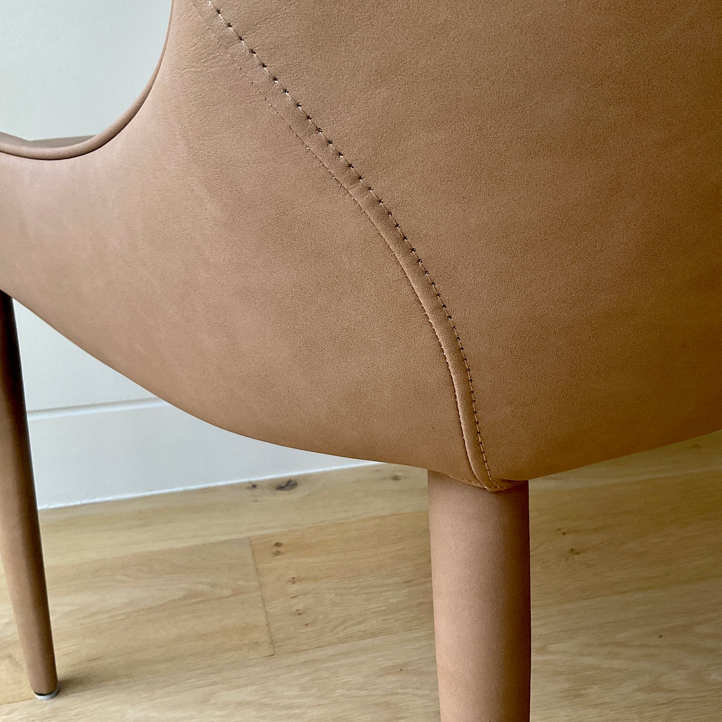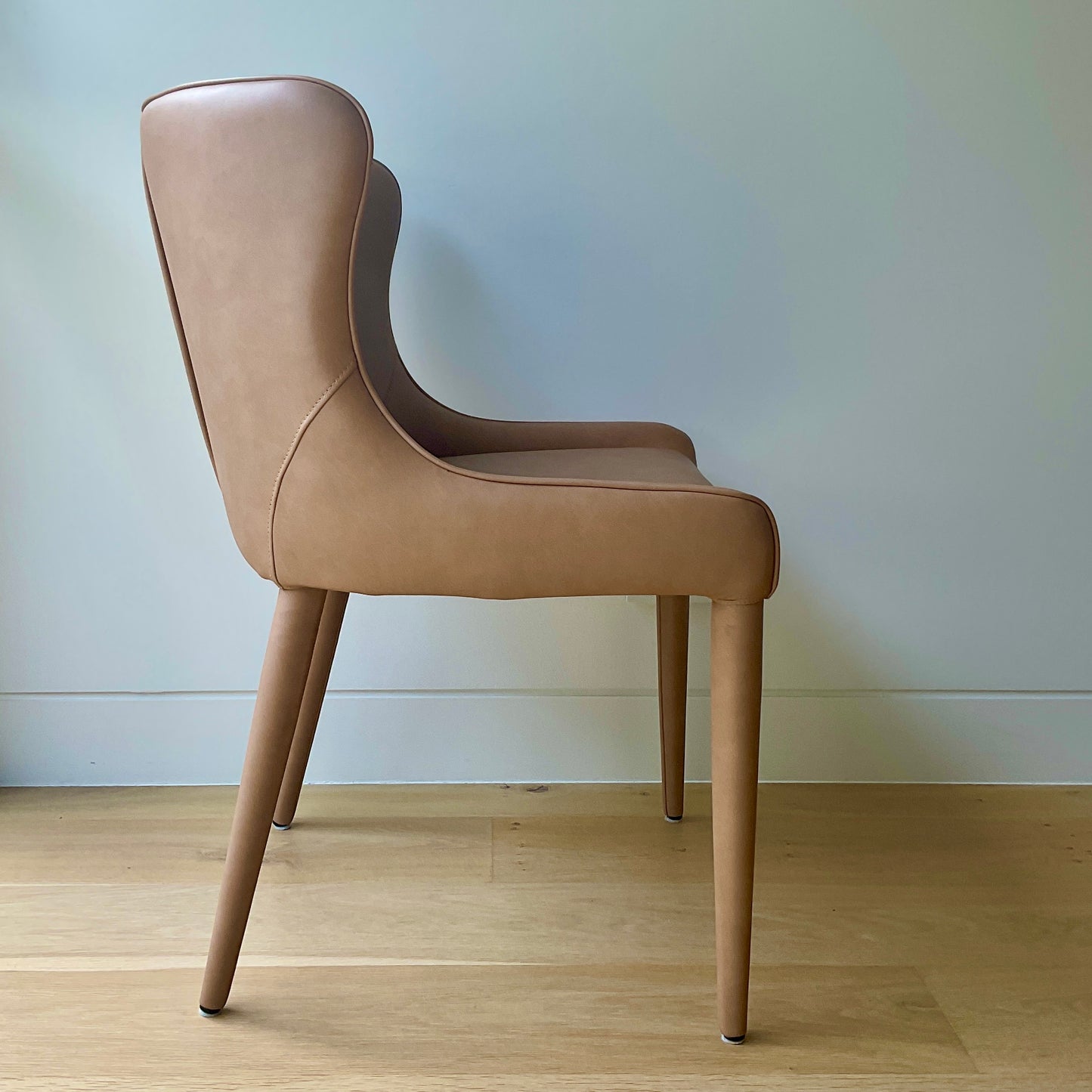Curvy contemporary dining chair with sculpted shape and waterfall seat. The chairs we have on offer are in tan vegan leather.