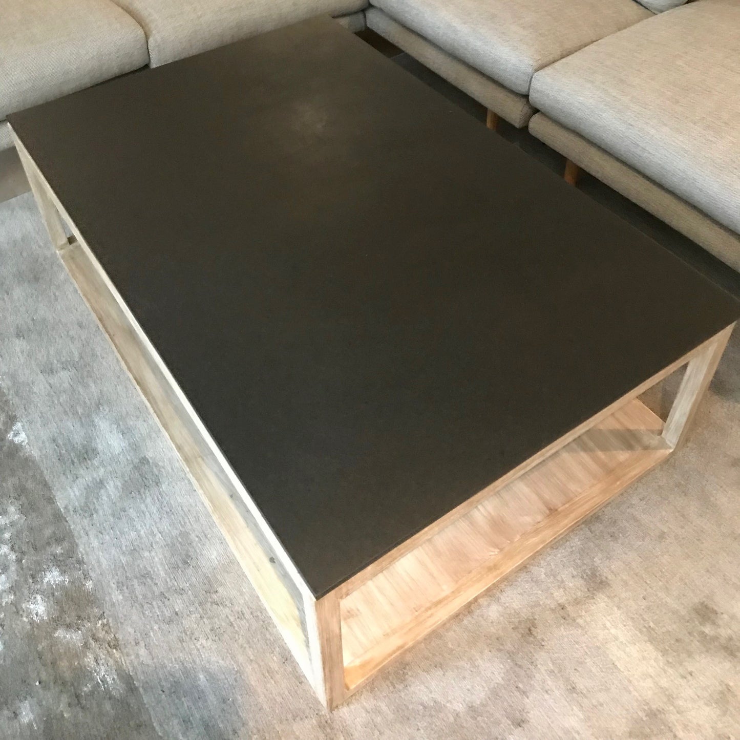 This simple coffee table has a lime wash oak timber frame and lower shelf with a black stone top.