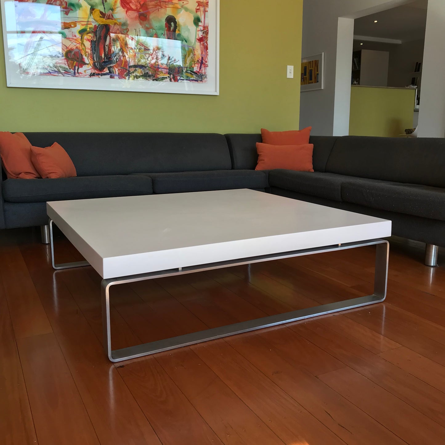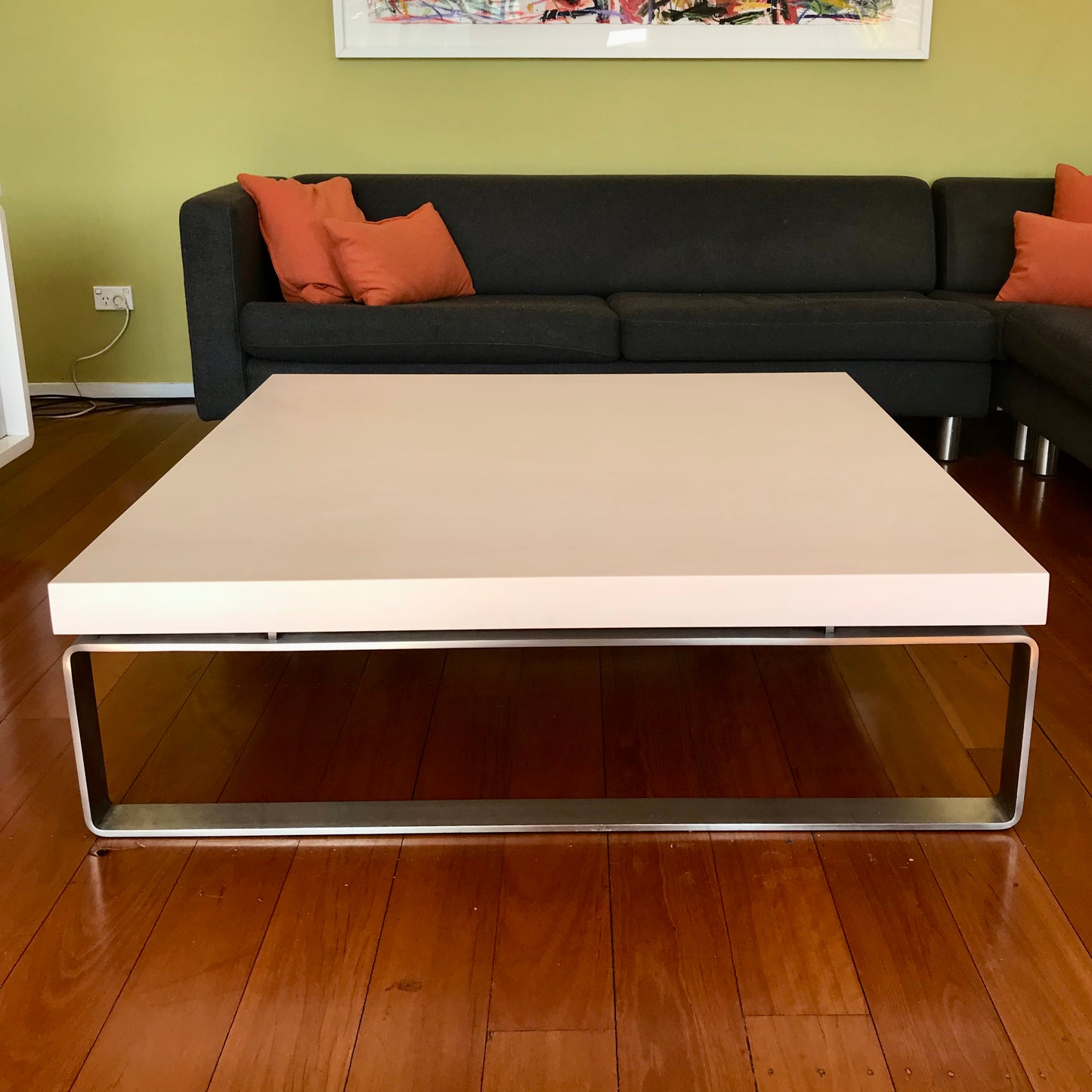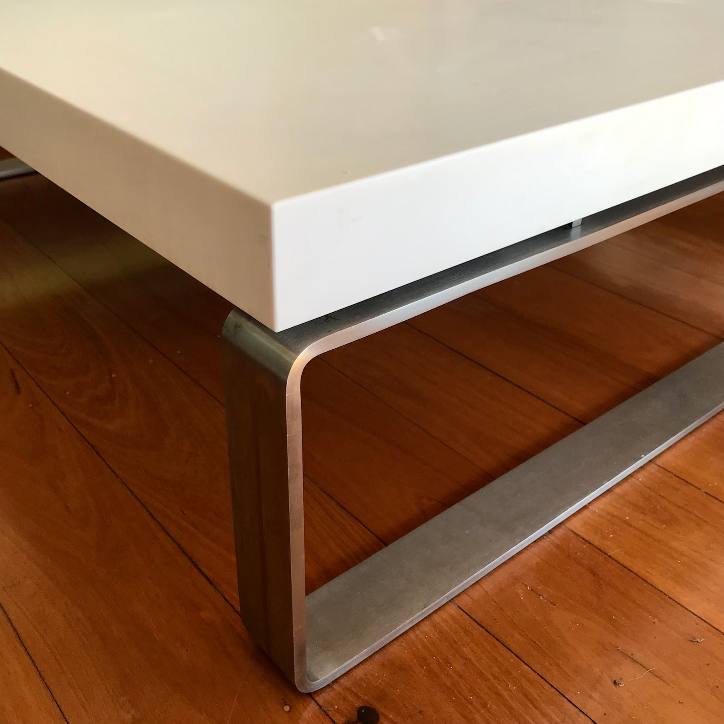 The Esta coffee table we have on offer has a white polymer top in a matte finish with linished stainless steel frame.