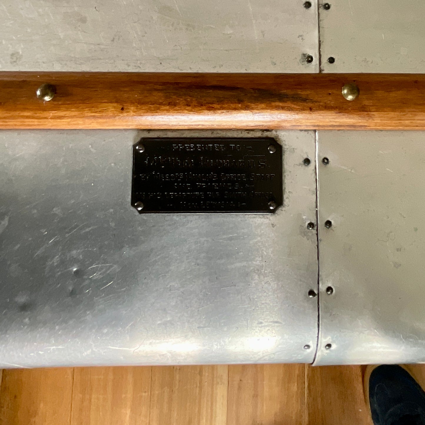A modern reinvention of an antique trunk. The romantic era of high sea voyages provides the backdrop for the story of the Globetrekker Coffee Table. This enchanting handcrafted piece comes inspired by the vintage trunks used by the passengers on these treks. Each trunk features intriguing detailing and beautiful plating enhanced further by black wooden banding and silver polished hardware. The exterior boasts hand-applied aluminum with nail detail and leather corner caps and handles. This winsome trunk table is sure to create a captivating scene in the loft or industrial style lounge.