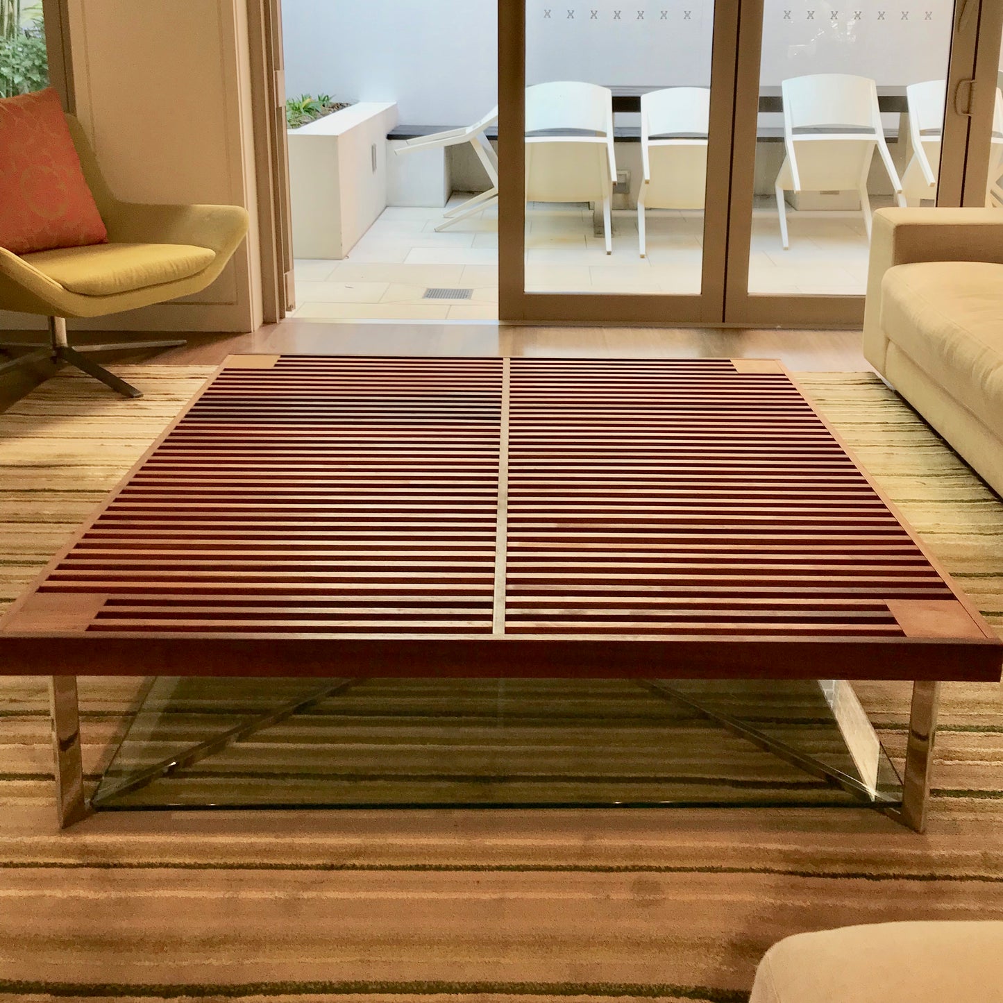 The Ponton low double-surfaced table has a slatted top made of solid walnut and a clear glass bottom that both rest on the brilliant chrome base.