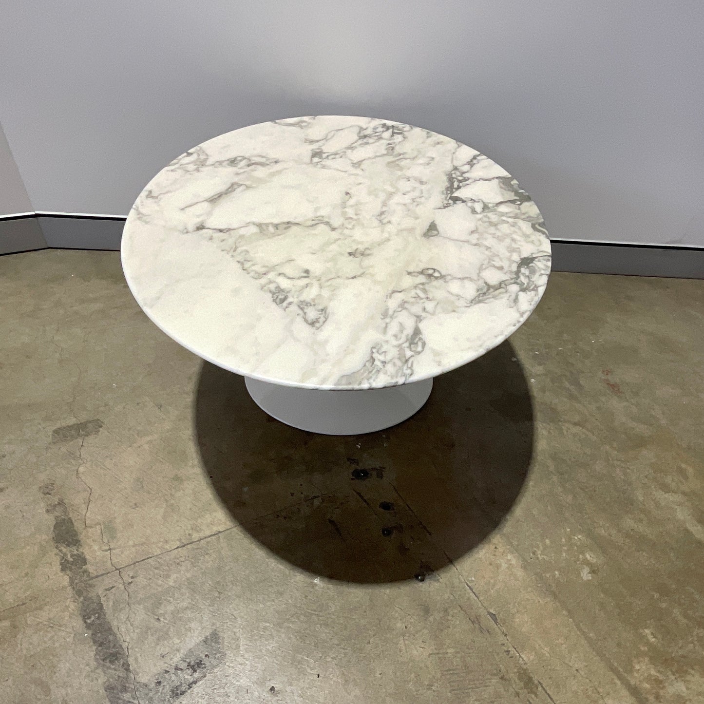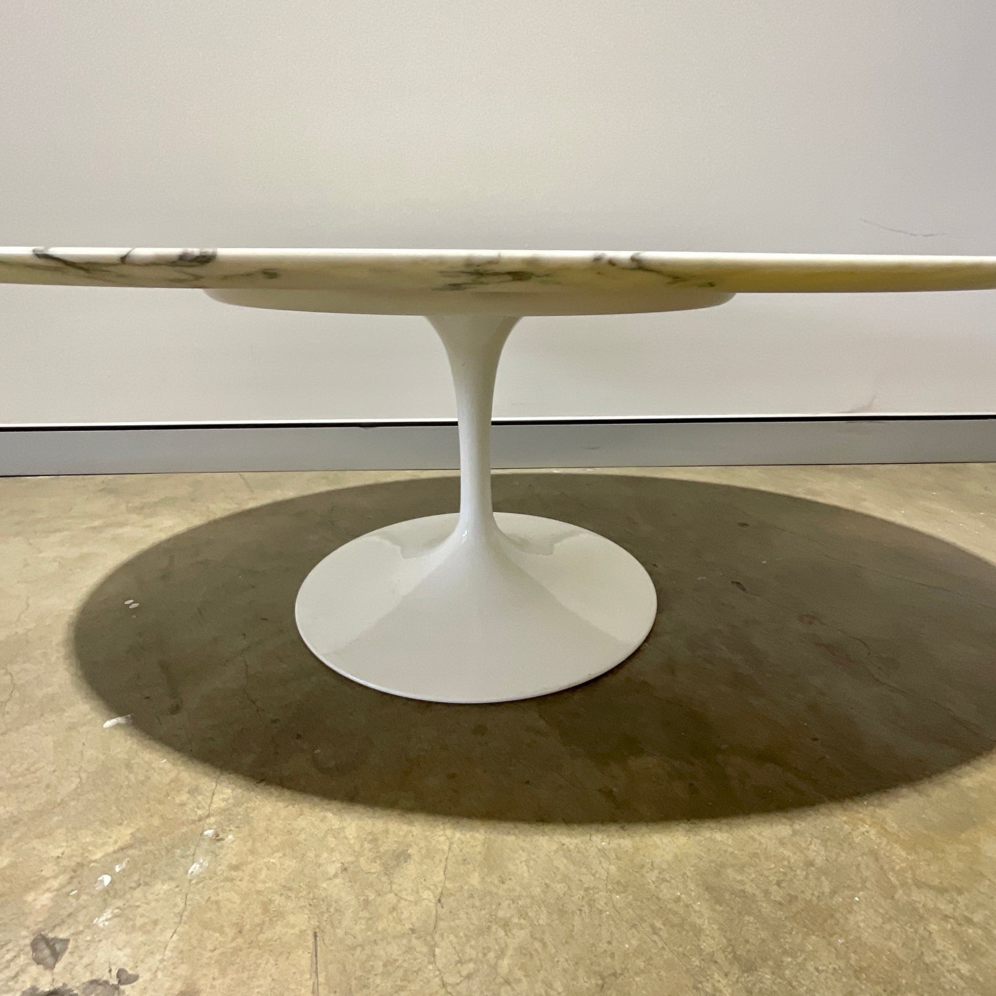 The Saarinen Tulip Coffee tables are available with a round or oval top at coffee table height. Base in cast aluminium coated in white Rilsan polyester coating.The table we have on offer is in Arabescato marble.