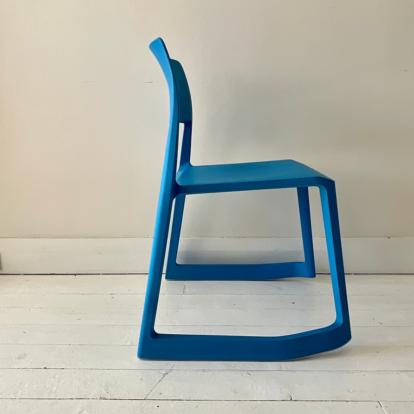 Tip Ton defines a whole new chair typology: the solid plastic chair with a forward-tilt action. Its name refers to the characteristic dual sitting postures – from a normal position, Tip Ton can be tipped forwards a few degrees, where the chair then stays in place. The forward-tilt position, until now the preserve of mechanical office chairs, straightens the pelvis and spine and thus improves circulation to the abdominal and back muscles. In a 2010 study, ETH Zurich – one of the world’s leading universities of applied sciences – investigated the health benefits of a forward-leaning sitting position. The results confirmed increased muscle activity in the abdominal and back areas, which boosts the supply of oxygen to all parts of the body. Tip Ton makes all of this possible for the first time ever in the form of an economical and robust plastic chair, thereby opening up many new areas of use. The chair we have on offer is in Glacier Blue.