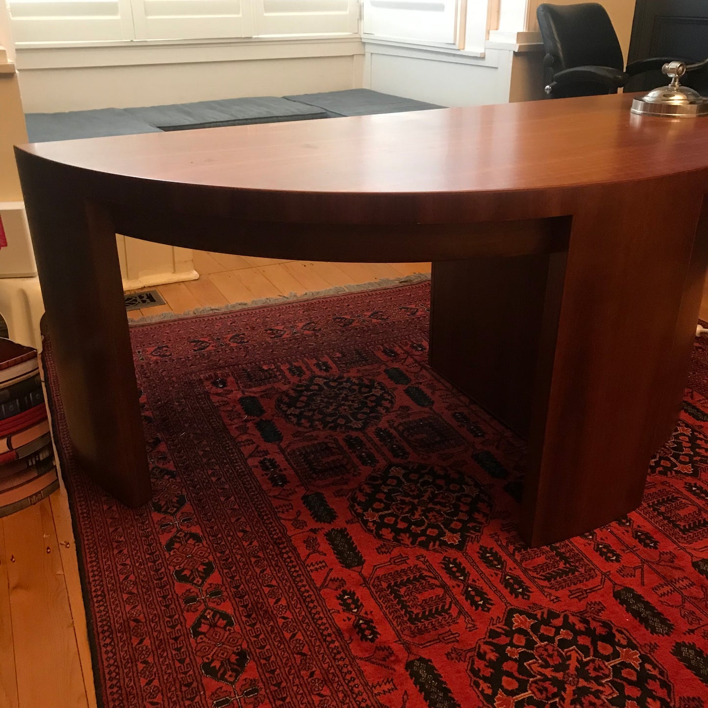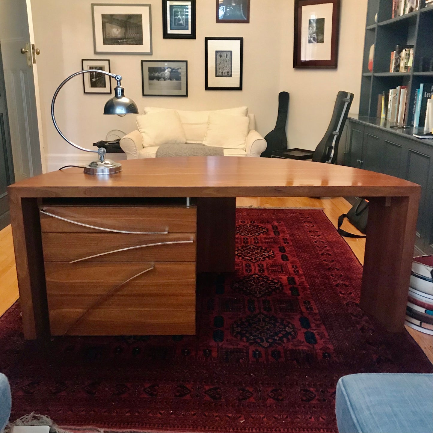 This custom made desk was designed to sit in art deco alcove. Beautifully constructed by planet furniture. The desk is semi circular shape with a drawer unit consisting of a file drawer and two soft close drawers.