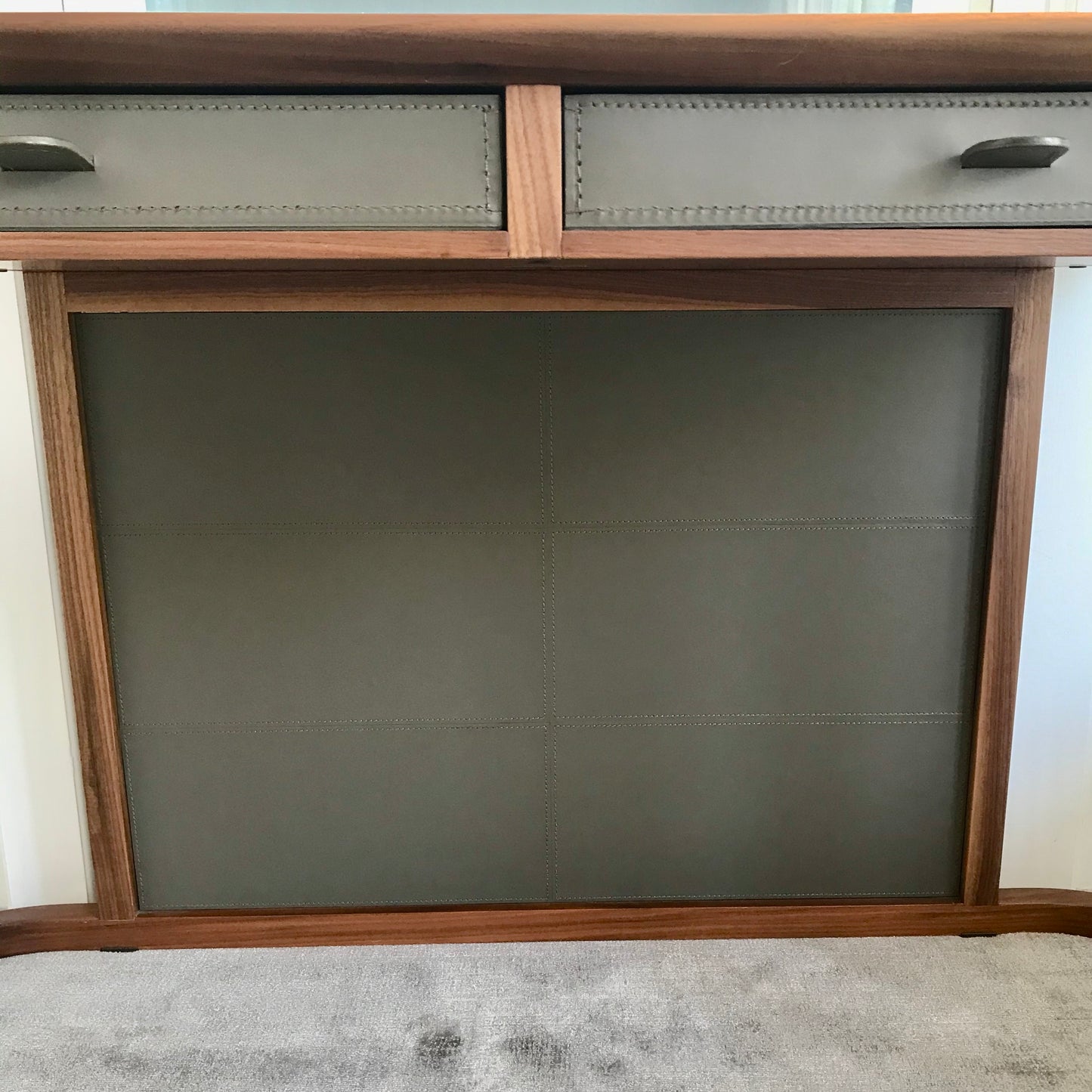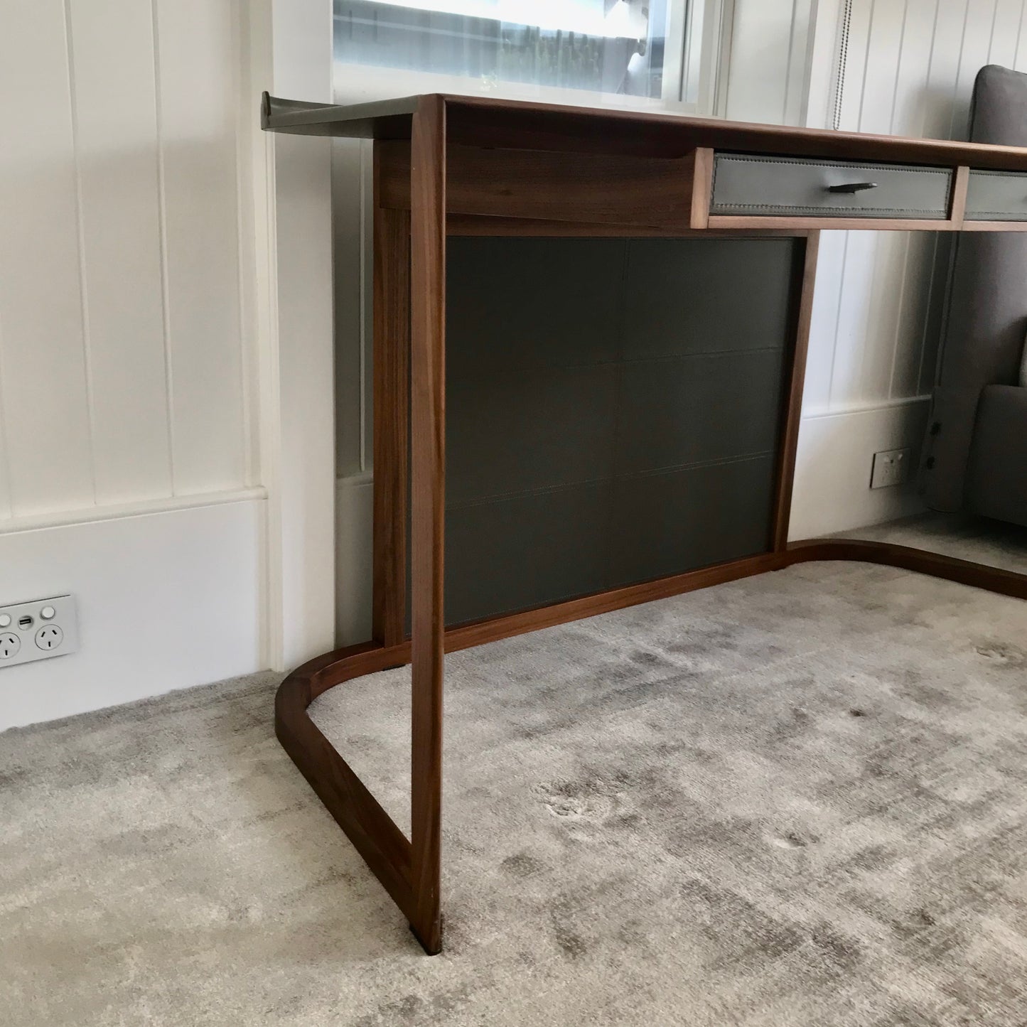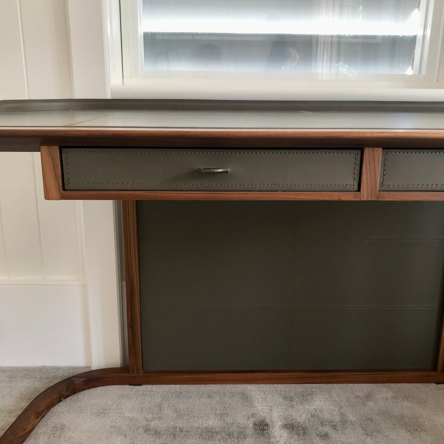 This writing desk in walnut canaletto wood and saddle leather harks back to the lightness and elegance of an Ionic column. A versatile and practical product which has been designed to make a work space and home office efficient and welcoming as well as being ideal for contract work and home environments. Writing desk with the frame in solid walnut canaletto wood. The top, the two drawers and the front closing panel are covered with saddle leather.
