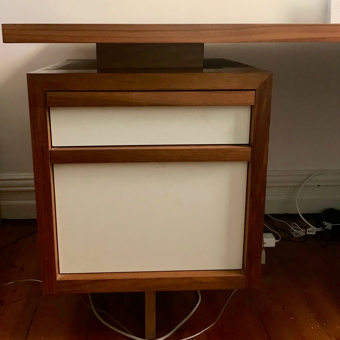 This American oak desk with return was designed by Spence & Lyda. The desk has a steel frame with oak top and a file drawer and stationary drawer on the left. The drawer fronts have a white 2 pack finish.