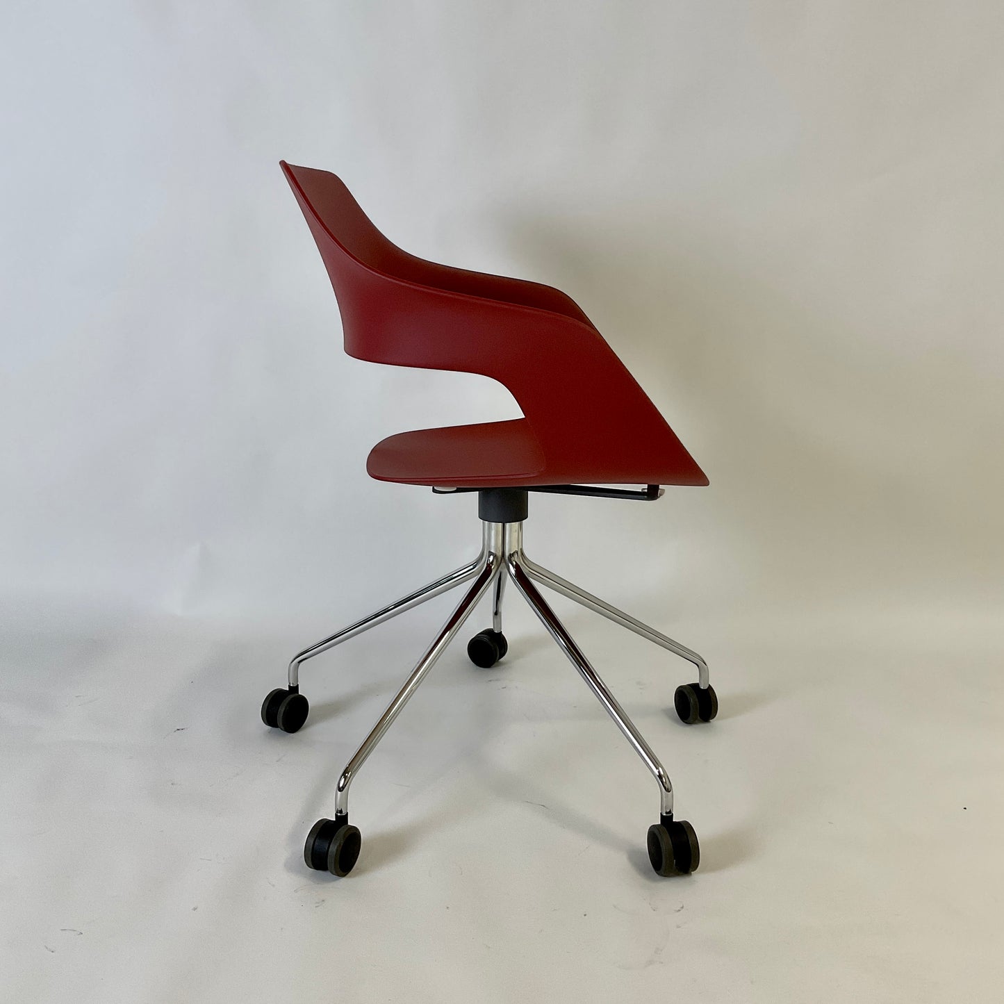 The chair we have on offer has chrome base with casters, Sienna Red polypropylene shell.
