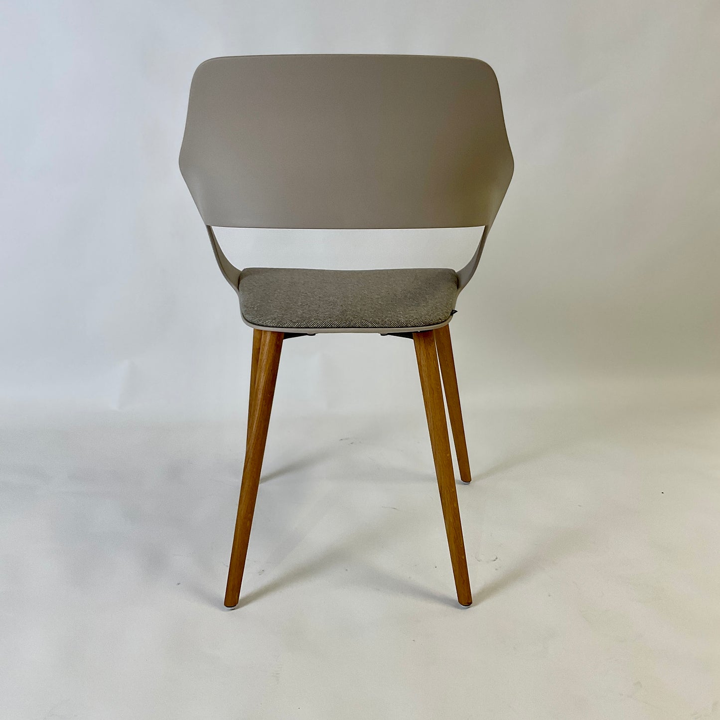 The chair we have on offer has Oak legs, Grey / Beige polypropylene shell, seat and inner back. Seat upholstered in fabric.