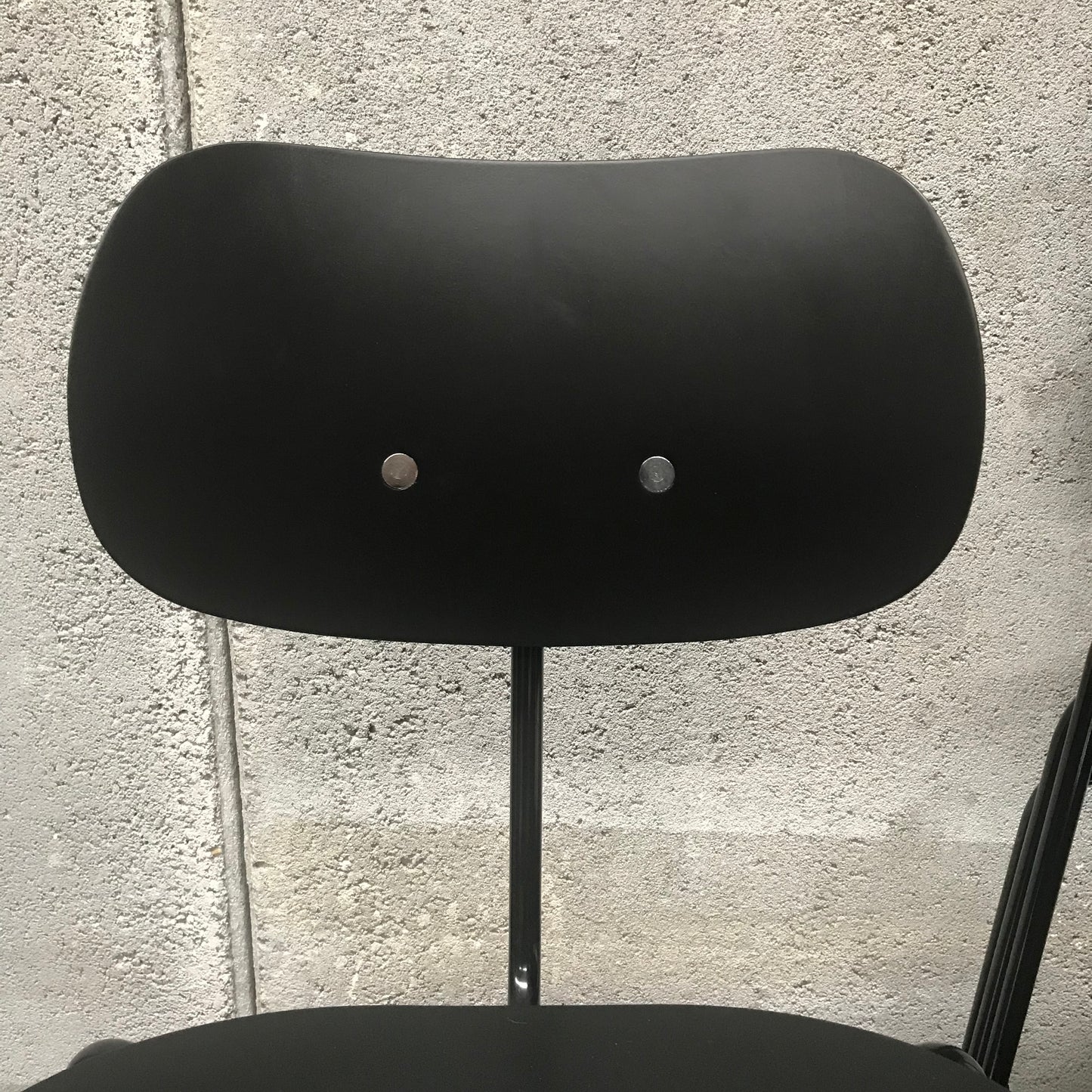 Moulded seat and backrest of laminated wood veneer. Backrest support of tubular steel Ø 18 × 2 mm.