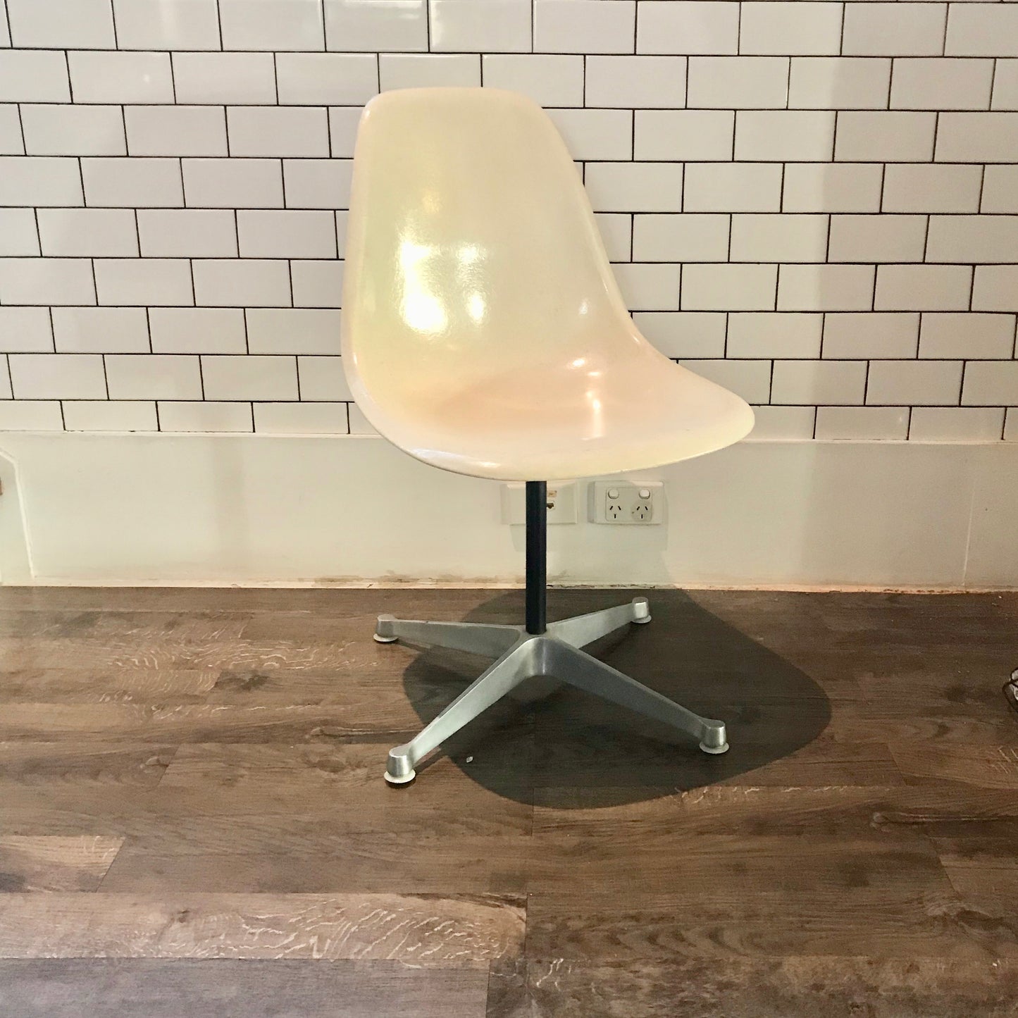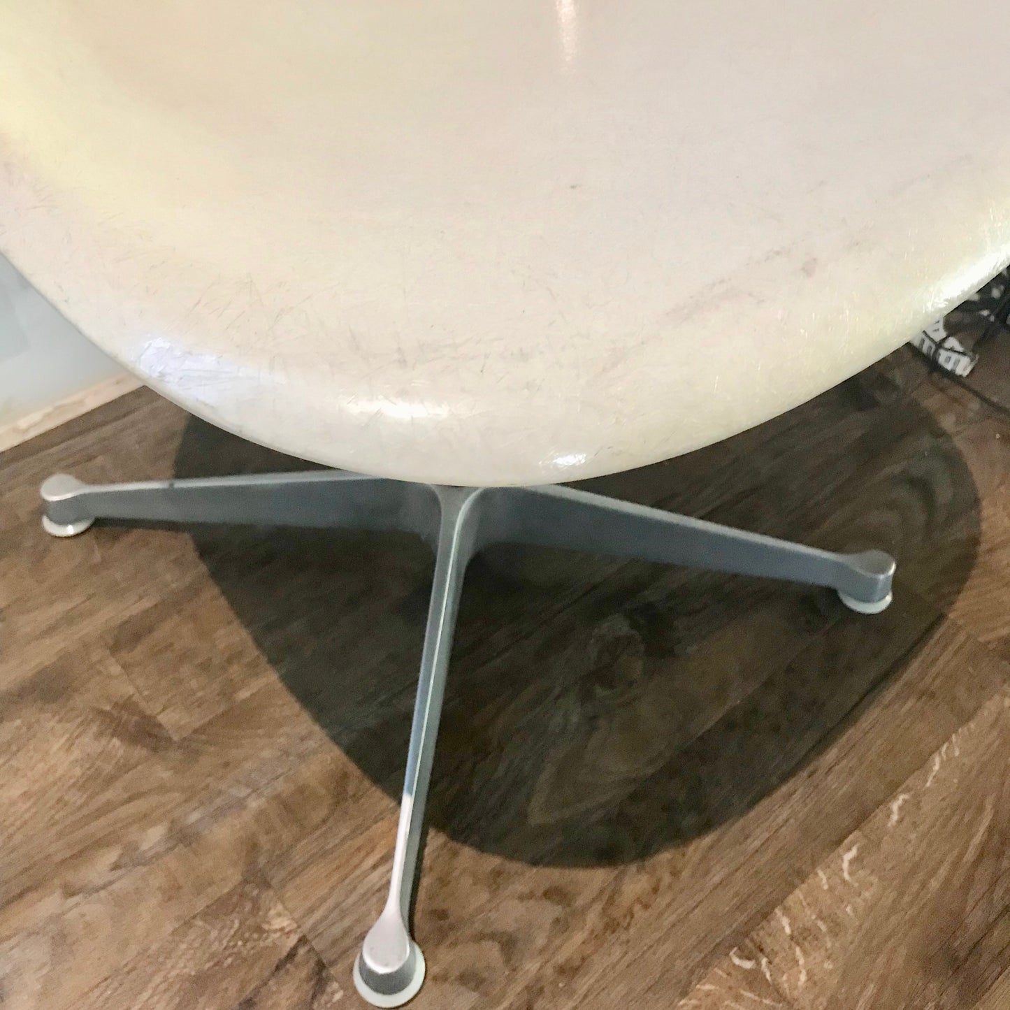 Classic Mid-Century Modern fibreglass swivel side shell chairs designed by Charles and Ray Eames, manufactured by Herman Miller. Remarkable condition for there age, early example, beautiful white fibreglass side shells atop cast aluminium four star base.