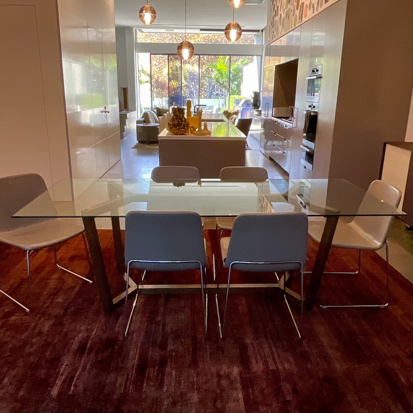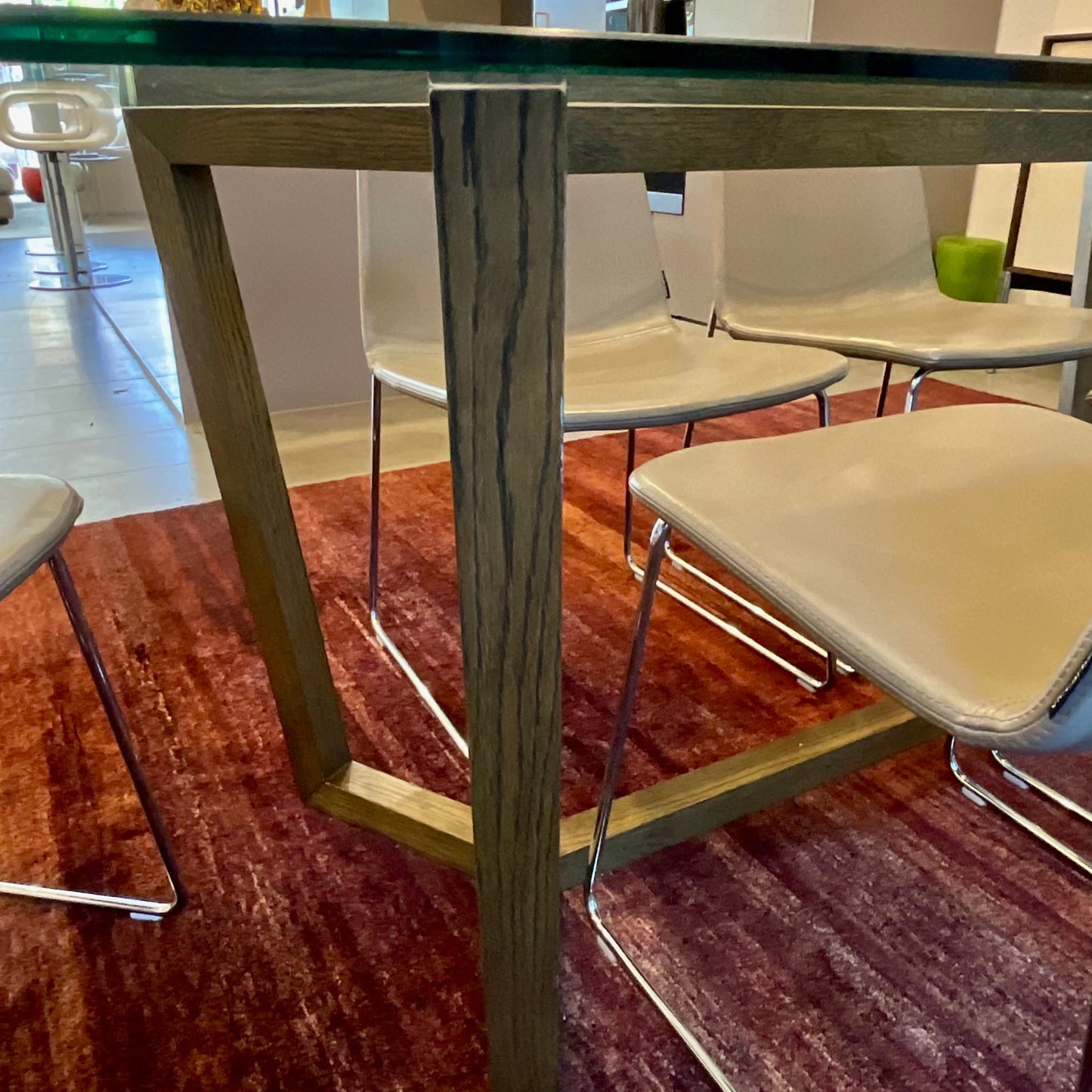 The Atticus was born in response to a custom project for Toyota to design two corporate dining tables using Australian Myrtle. The design received such acclaim that it was modified to a residential scale and has been Lowe Furniture’s bestselling customisable design ever since. International design superstar and personal friend Patricia Urquiola once commented upon seeing it in the Hub showroom that if she had to sit at a table designed by someone other than herself, this table would be it! The table we have on offer has a American Oak timber base with custom smoked finish. The table top is clear tempered glass.