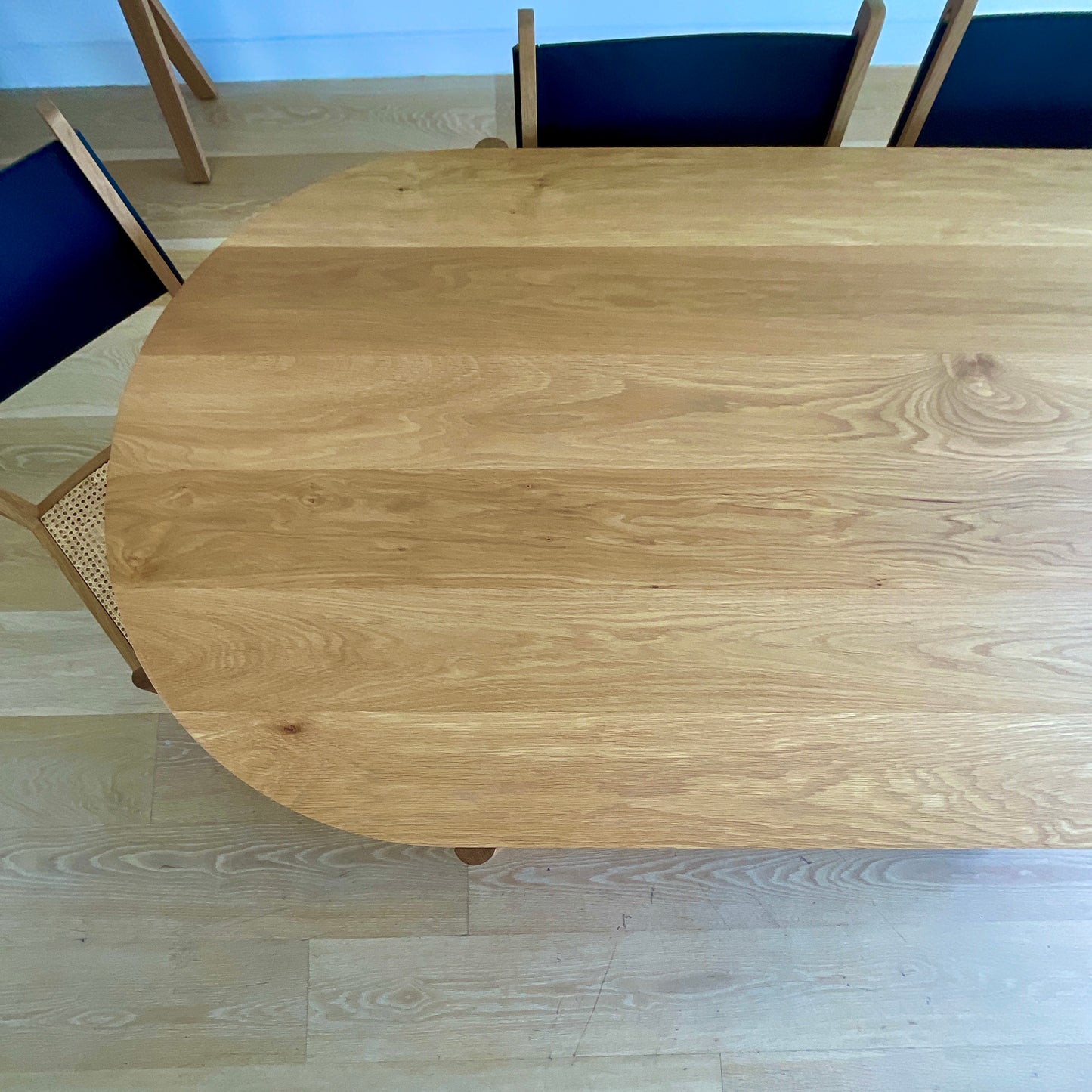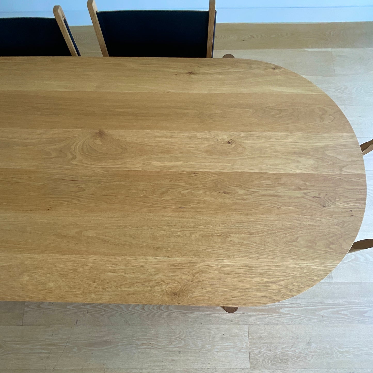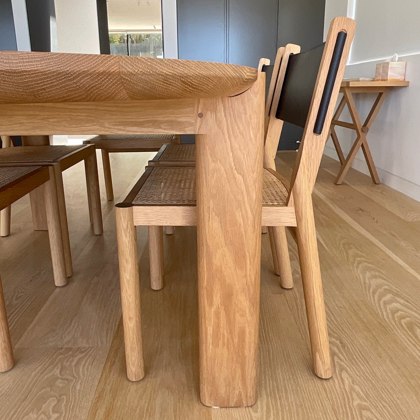 Gentle soft curves nest beautifully around Otis from every angle. Featuring a large radius edge on top which intersects the pill shaped leg, Otis celebrates an elegance of craftsmanship and subtle detail. Solid oak base and top. Also available with a travertine top with an unfilled edge. The table we have on offer is a natural finish. Seats six.