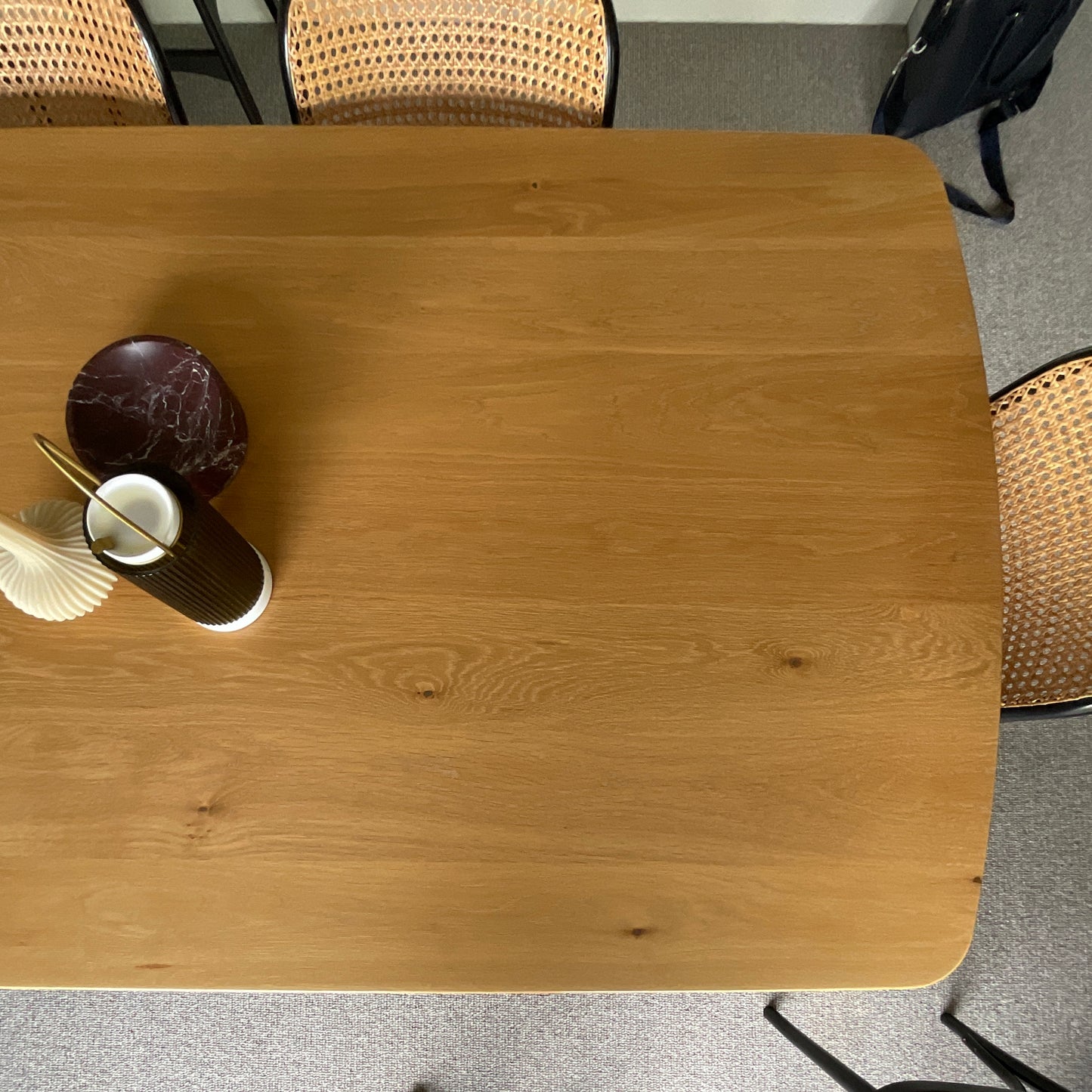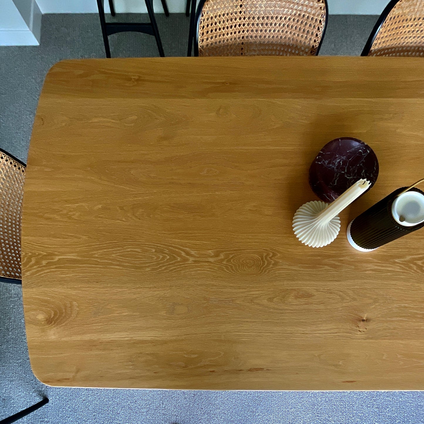 This beautifully sculpted timber table is poetry in solid American oak. The result of expert craftsmanship, traditional joinery and attention to detail, Quincy would be perfect in almost any home. Environmentally sustainable kiln-dried American oak hardwood construction, crafted using traditional joinery techniques. The table we have on offer is in Natural Oak
