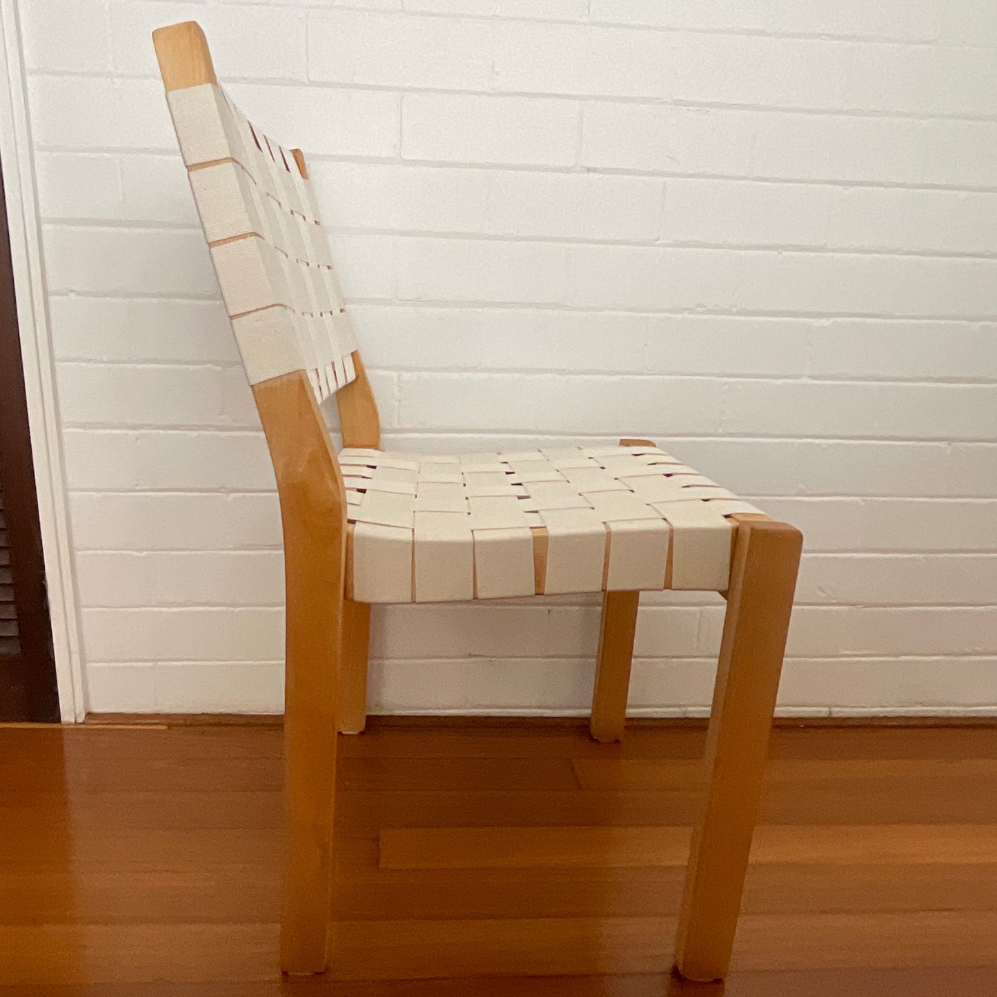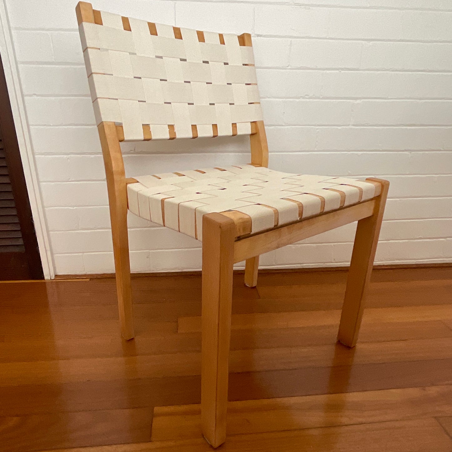 Artek’s Chair 611 was designed by Alvar Aalto in 1929. Chair 611 was one of Aalto's first furniture designs, and it has been in continuous production ever since – its clear, relaxed and functional appearance makes it a great fit also in modern interiors. Chair 611 has a solid birch frame with a fabric webbing, giving it a soft, natural character and making it easy to re-upholster again. Chair 611 makes an excellent dining chair or side chair in both private and public contexts. The Chairs we have on offer have a birch frame with natural / white webbing.