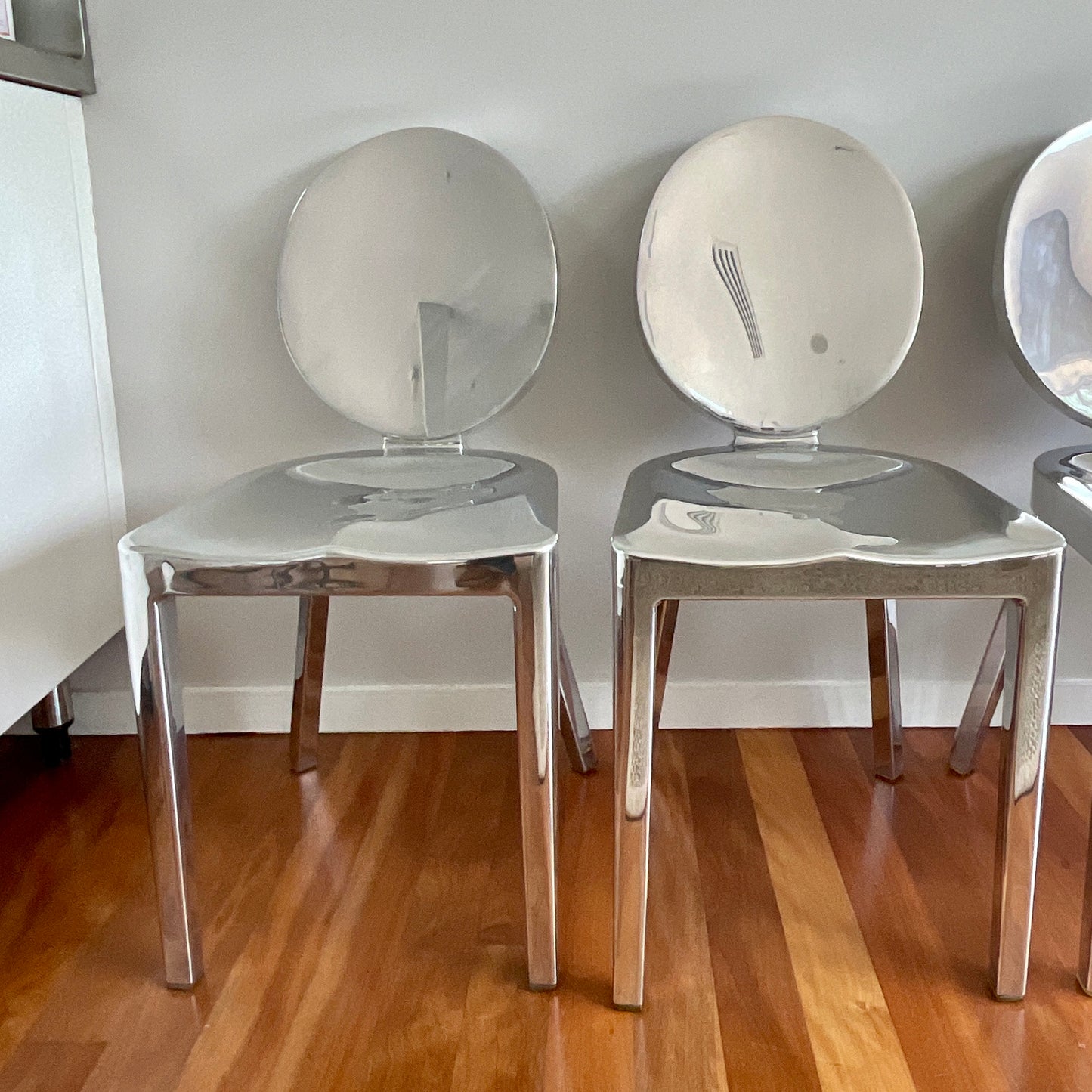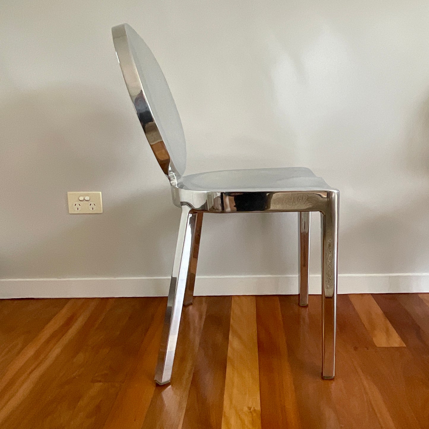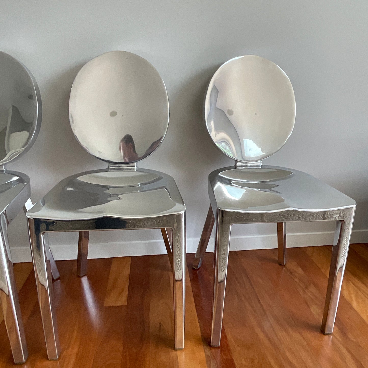 A timeless piece, built for lifetimes of use, to be kept, cherished and passed on for generations. Made to order. Built by hand from recycled aluminum in Hanover, Pennsylvania by our most skilled craftsmen. Guaranteed for life. First designed for the Chinese restaurant Kong in Paris. The one armed barstool was intended to make it easy and graceful for the guests to slither in and out of the bar. Kong requires the hand welding of 24 separate pieces of aluminum, and 8 hours of hand polishing. Standard glides: soft plastic TPU glides for all-around use, including outdoor use.