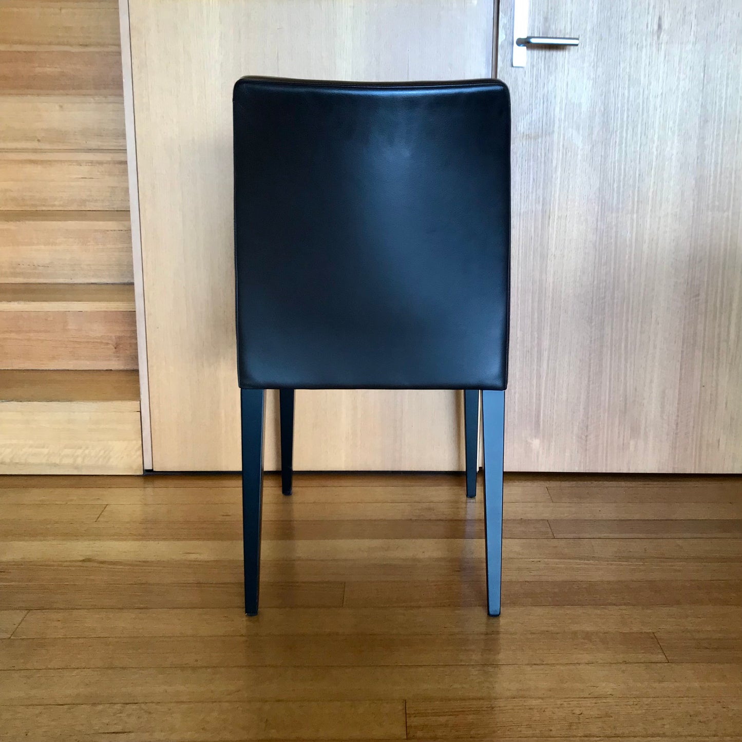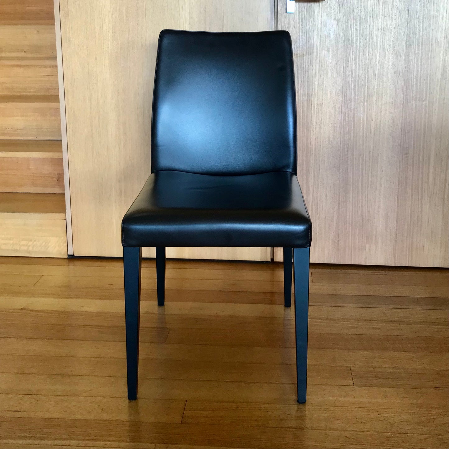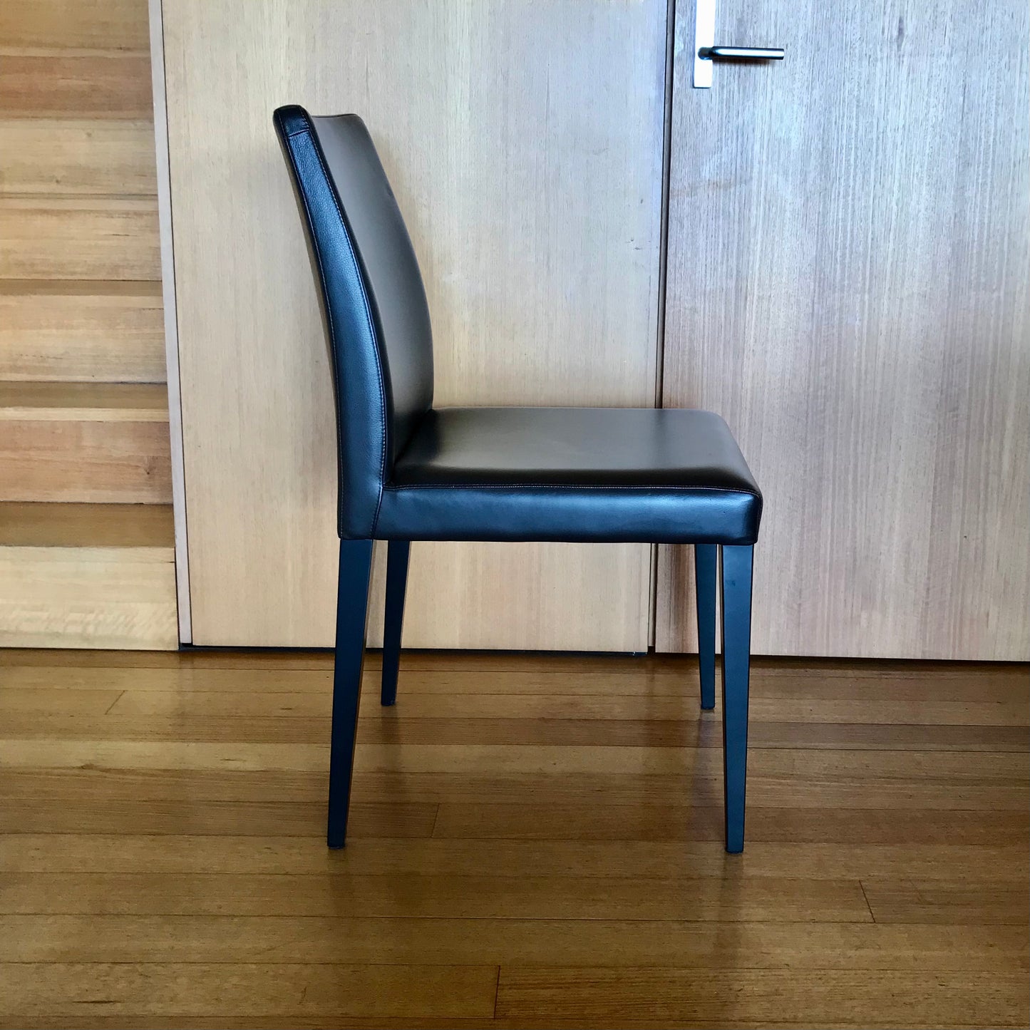 The Liz dining chairs we have on offer are upholstered in Poltrona Frau Leather 29 Ardesia (it reads black but is actually a really dark brown) the legs are stained 12 Black ash, with wood grain visible.