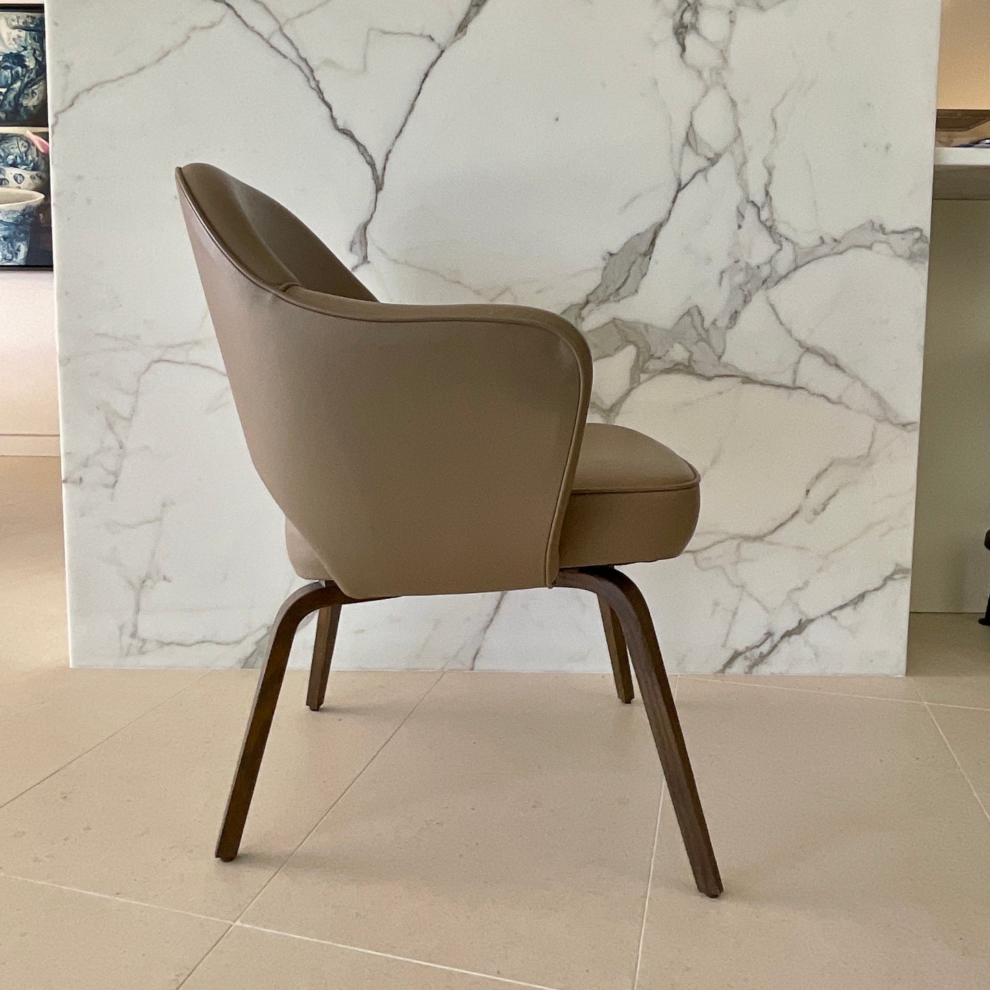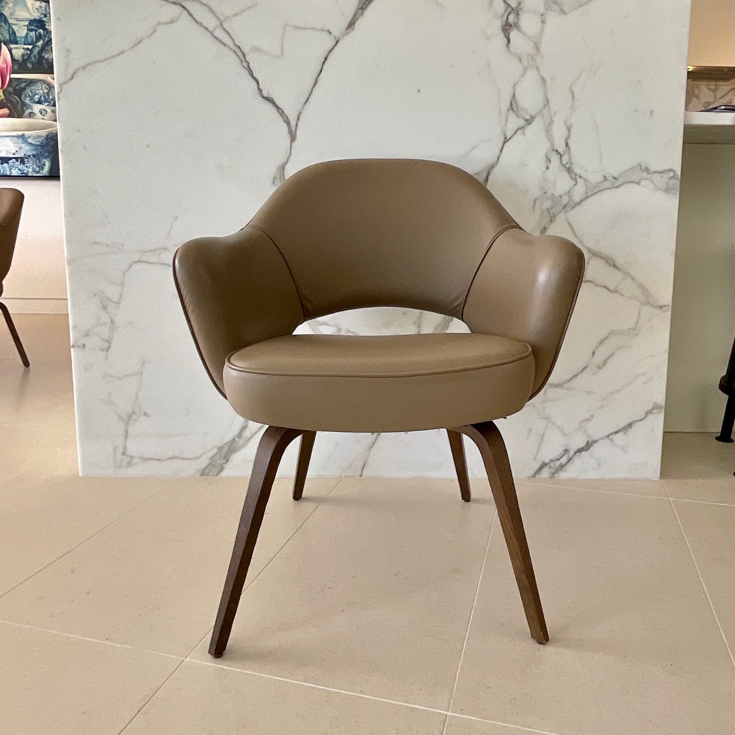 Featured in nearly every Florence Knoll interior, the Saarinen Executive Chair remains one of the most popular Knoll designs. Originally introduced in 1950, the chair transformed the notion of what executive seating could be with its fluid, sculptural form and modern finishing. The timeless and versatile design continues to fit seamlessly into work, conference, lounge and dining applications of any decor. The chairs we have on offer are upholstered in a taupe leather with Walnut legs.