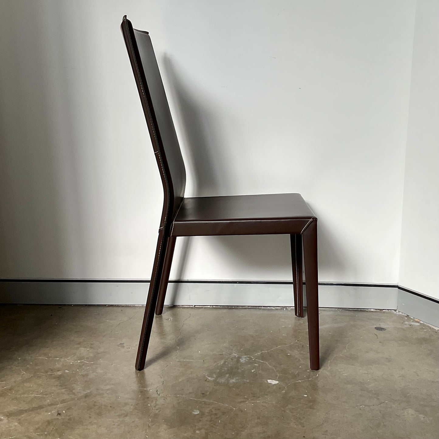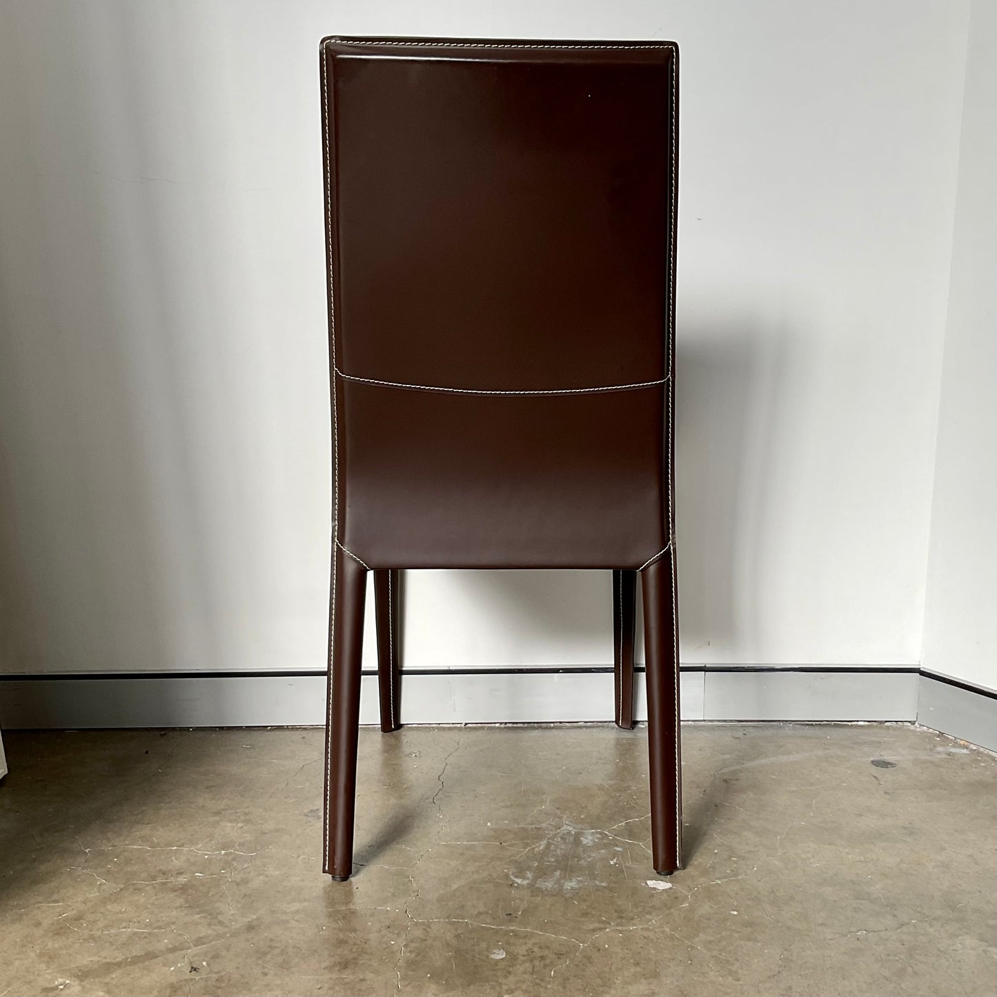 Chair with metal frame covered in leather. Standard stitching.