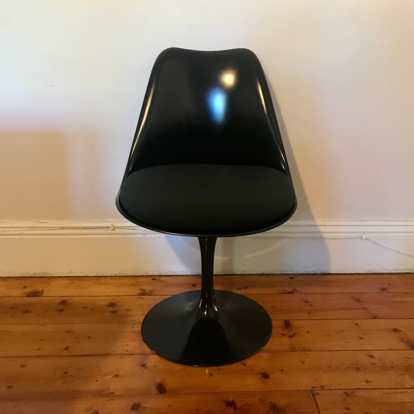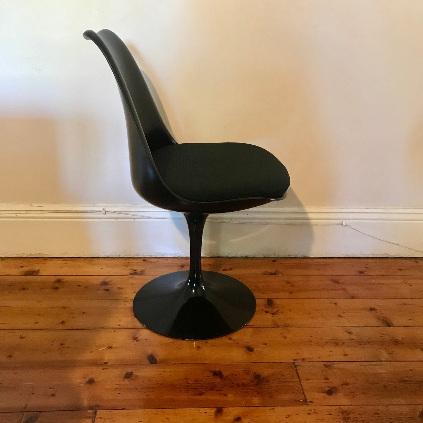 With the Pedestal Collection, Eero Saarinen resolved the "ugly, confusing, unrestful world" underneath tables and chairs. The collection is a defining accomplishment of modern design and a timeless addition to your home—a true classic. Pair Tulip Chairs with a Saarinen Table for the quintessential modern dining set, or mix and match for a statement in any room. The chairs we have on offer are in black with a Knoll common ground black fabric seat pad.
