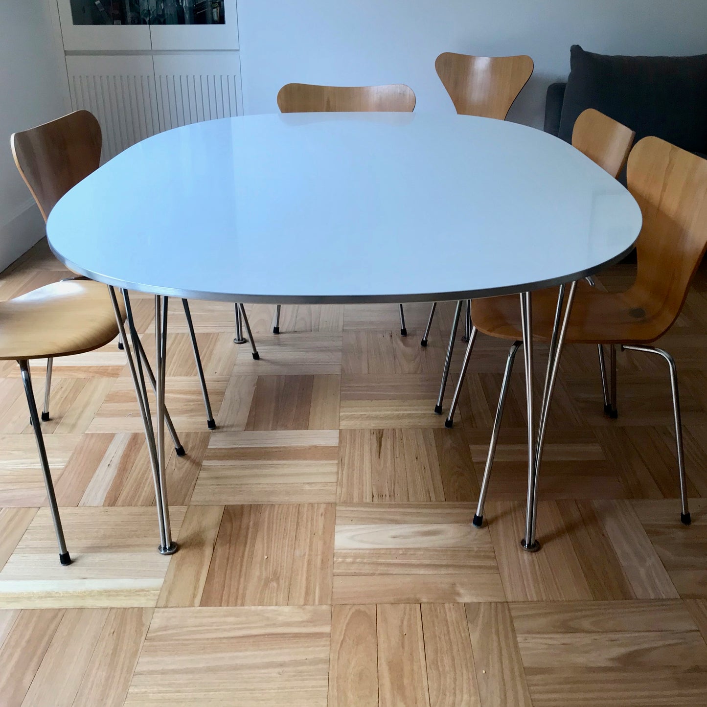 The Spanleg Dining Table by Fritz Hansen is part of a series includes the Super-Elliptical™, designed by Piet Hein and Bruno Mathsson and circular, square and rectangular tables designed by Arne Jacobsen. The most prominent member of the series, the Super-Elliptical table, was inspired by the designer Piet Hein’s solution to a traffic problem at Sergels Torg in Stockholm: A super elliptical roundabout. The ingenious shape was conceived in his mathematical mind. This variation of an oval possessed some attractive qualities and looked surprisingly harmonious no matter the size. The formula based shape has no ends and this is why the Super-Elliptical table can be seen as a democratic table where everyone has an equal position. Piet Hein, Bruno Mathsson and Arne Jacobsen contributed to the base design of all the tables. The table we have on offer has a white top with aluminium band edge.