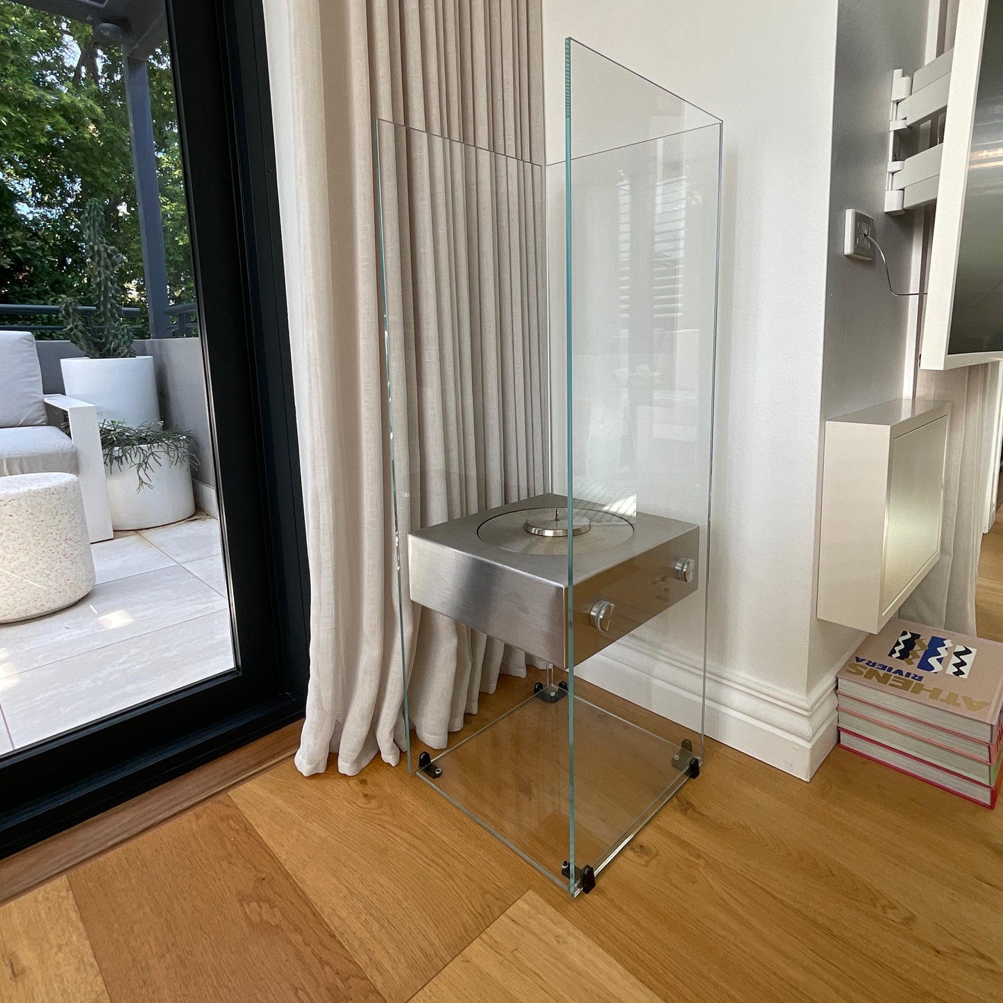 Made entirely of glass and steel, the Ghost is a slim framed fireplace that works equally well in residential and commercial spaces. Though its crisp lines and glass body give it a strong modern feel, its transparency allows it to fit into design schemes of any fashion and color.