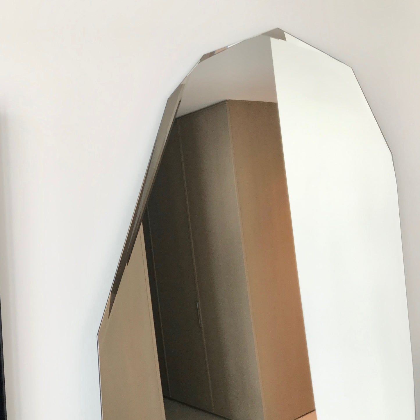 Kooh-I-Noor specchi is a standing mirror featuring an irregularly shaped faceted perimeter and special chamferings with variable depths and inclinations.