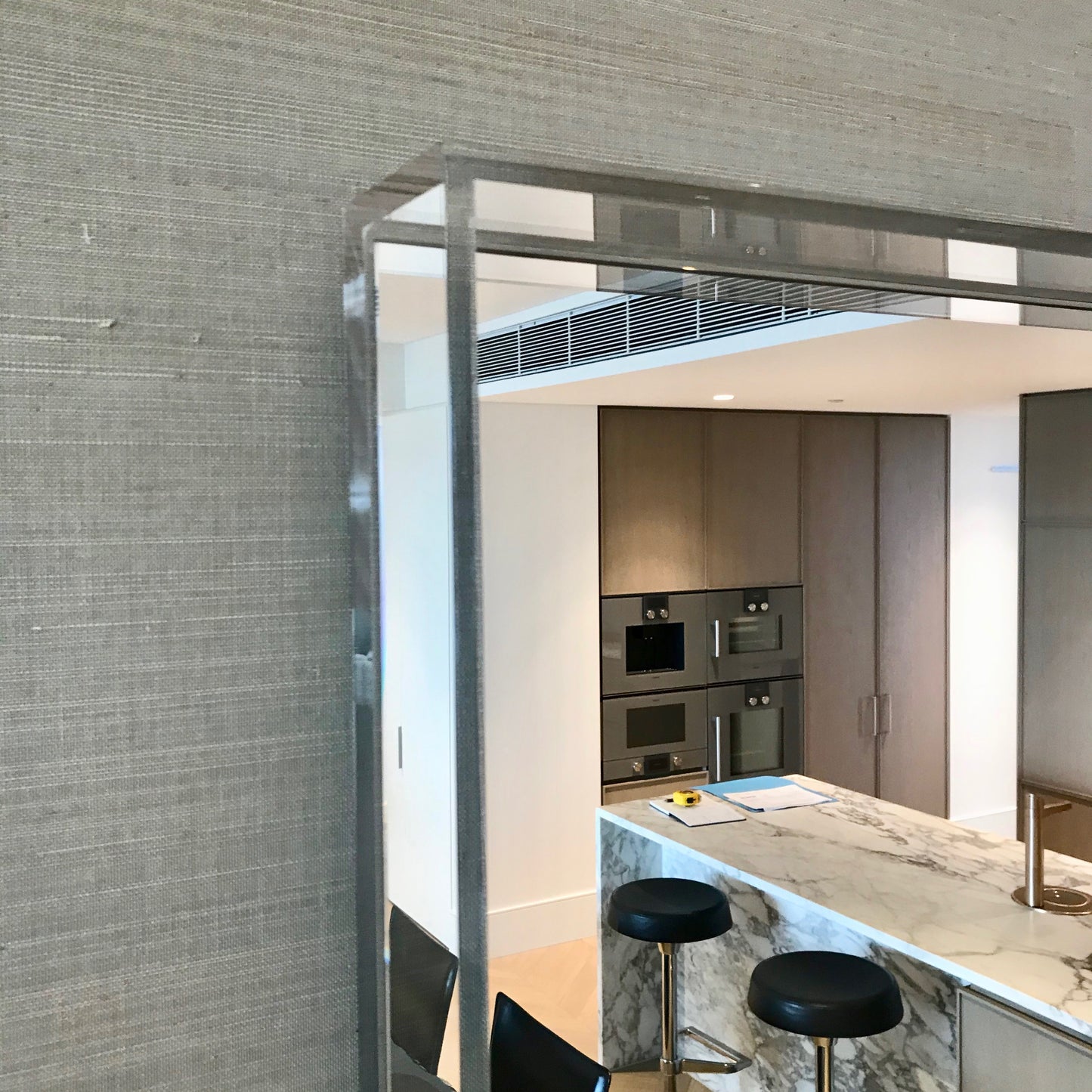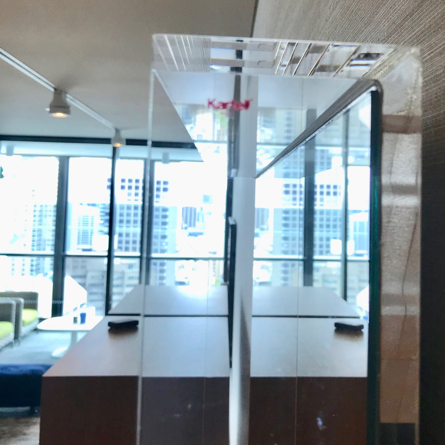 The new collection of mirrors signed by Philippe Starck includes three versions of the first wall mirror in the catalogue with a white or black glossy or a transparent frame measuring 80 x 180 cm. The mirror we have on offer is in transparent crystal.