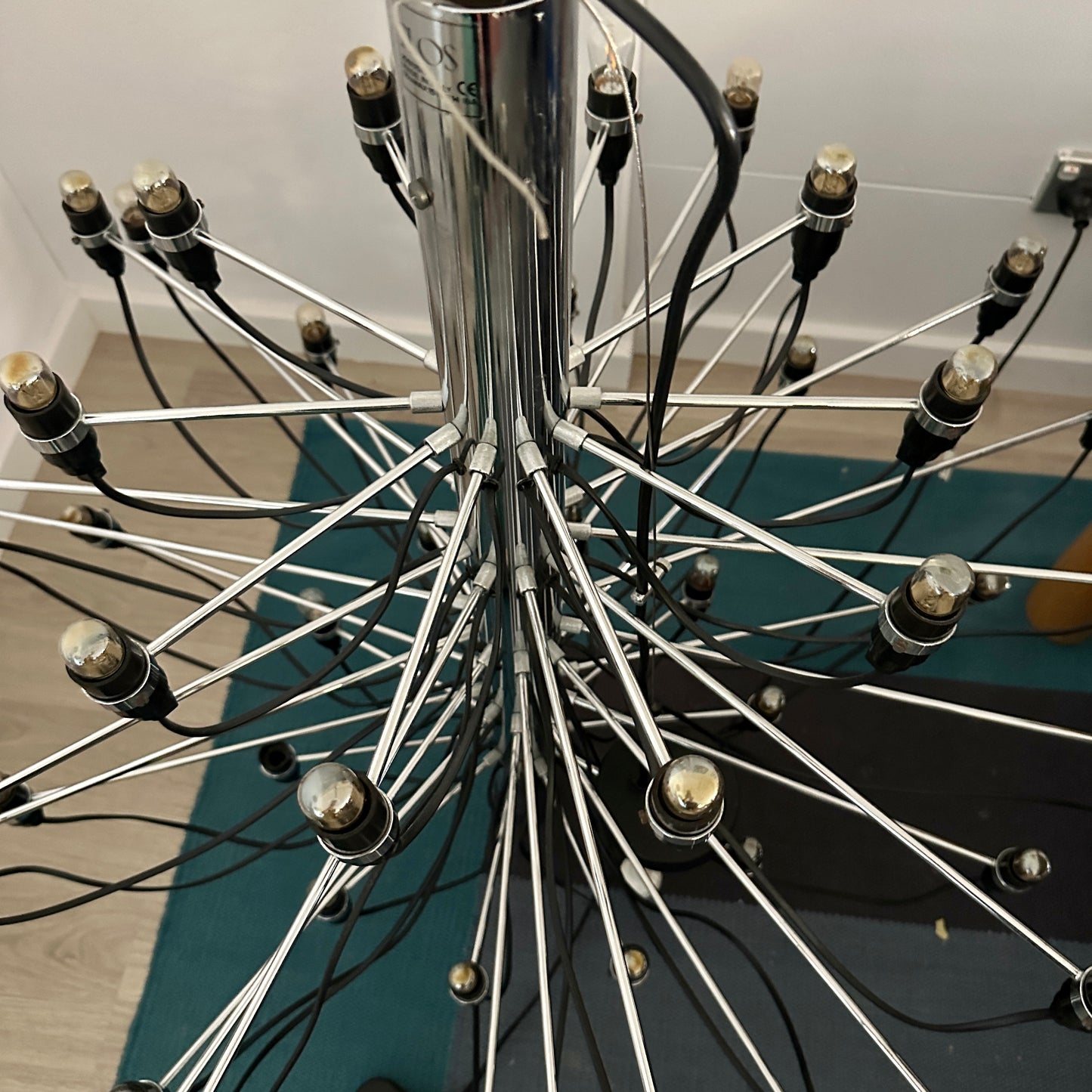 Suspension lamp providing diffused light. Steel central structure with brass arms, both available either chromium-plated, black or golded. Steel ceiling fitting and rose. The fixture we have on offer is in polished chrome. Bulbs are not included. Can be purchased separately with your choice of clear or frosted.