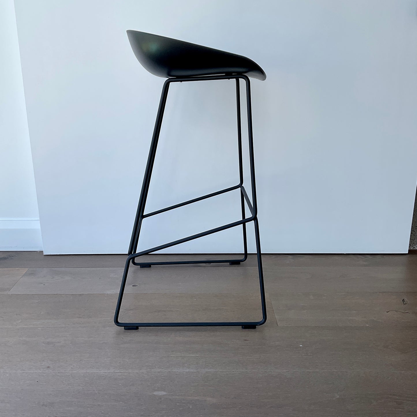 The bar stool About A Stool AAS 38 has the same capacity for transformation as the other members in the series, ranging from a minimalistic plastic stool to a more full-bodied upholstered version. The curved backrest is balanced on an elegant rounded frame in metal, showcasing a more industrial design with a strong visual presence. Suitable for as using as a bar stool in bars and restaurants, as well as at home for informal meals. The stool we have on offer is in black on black.