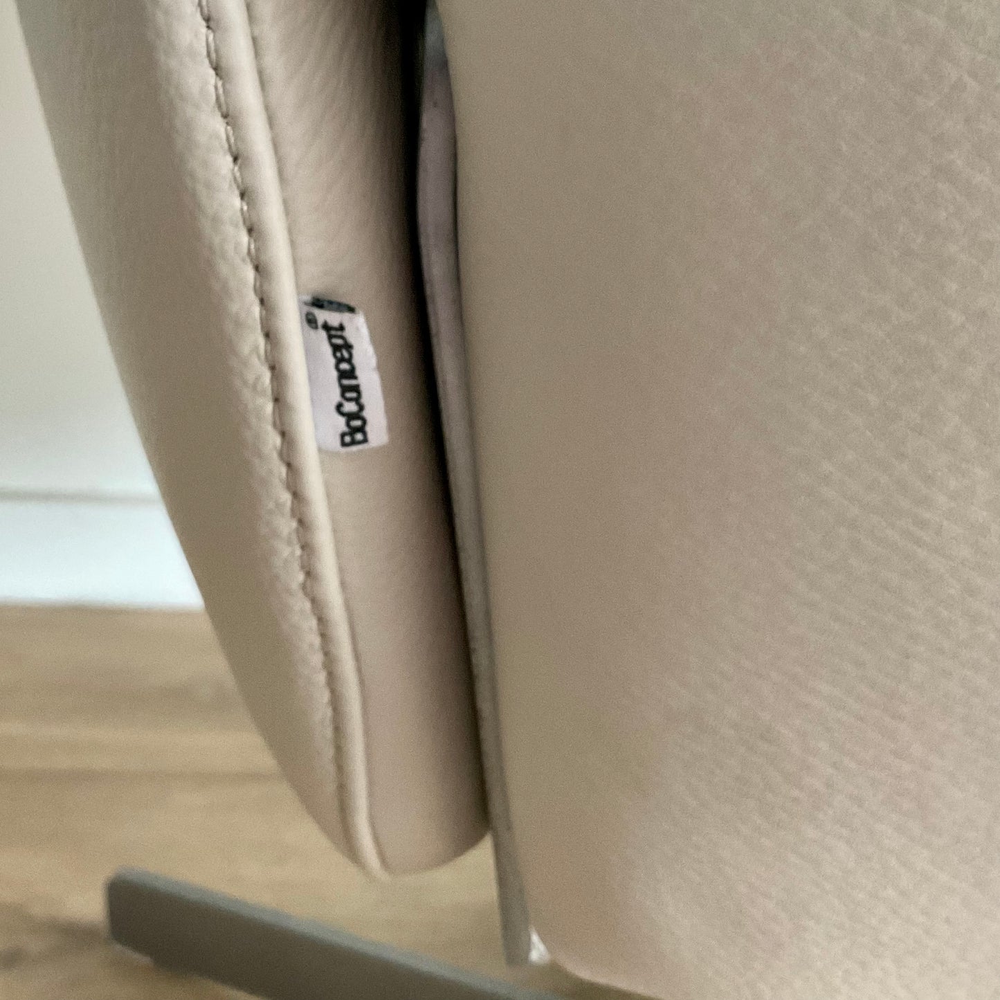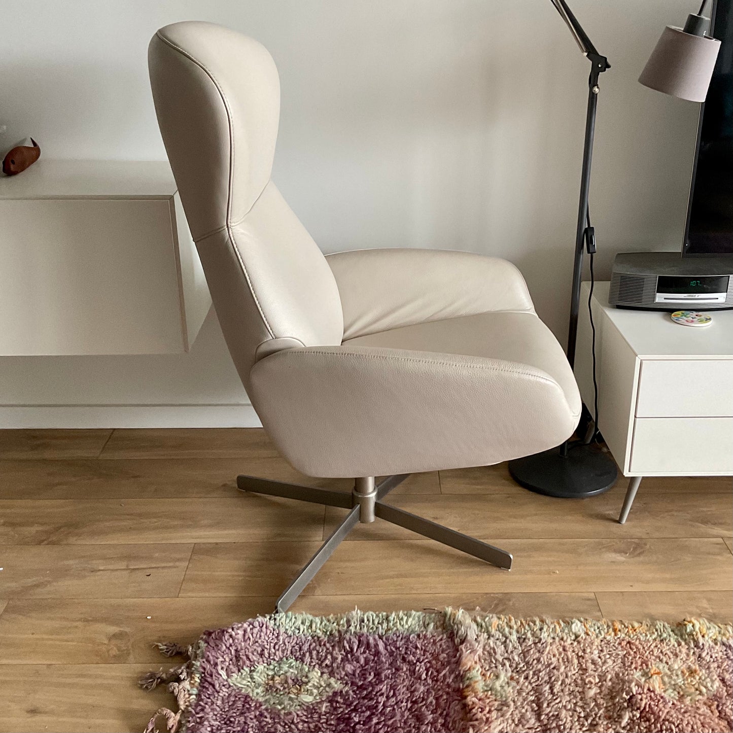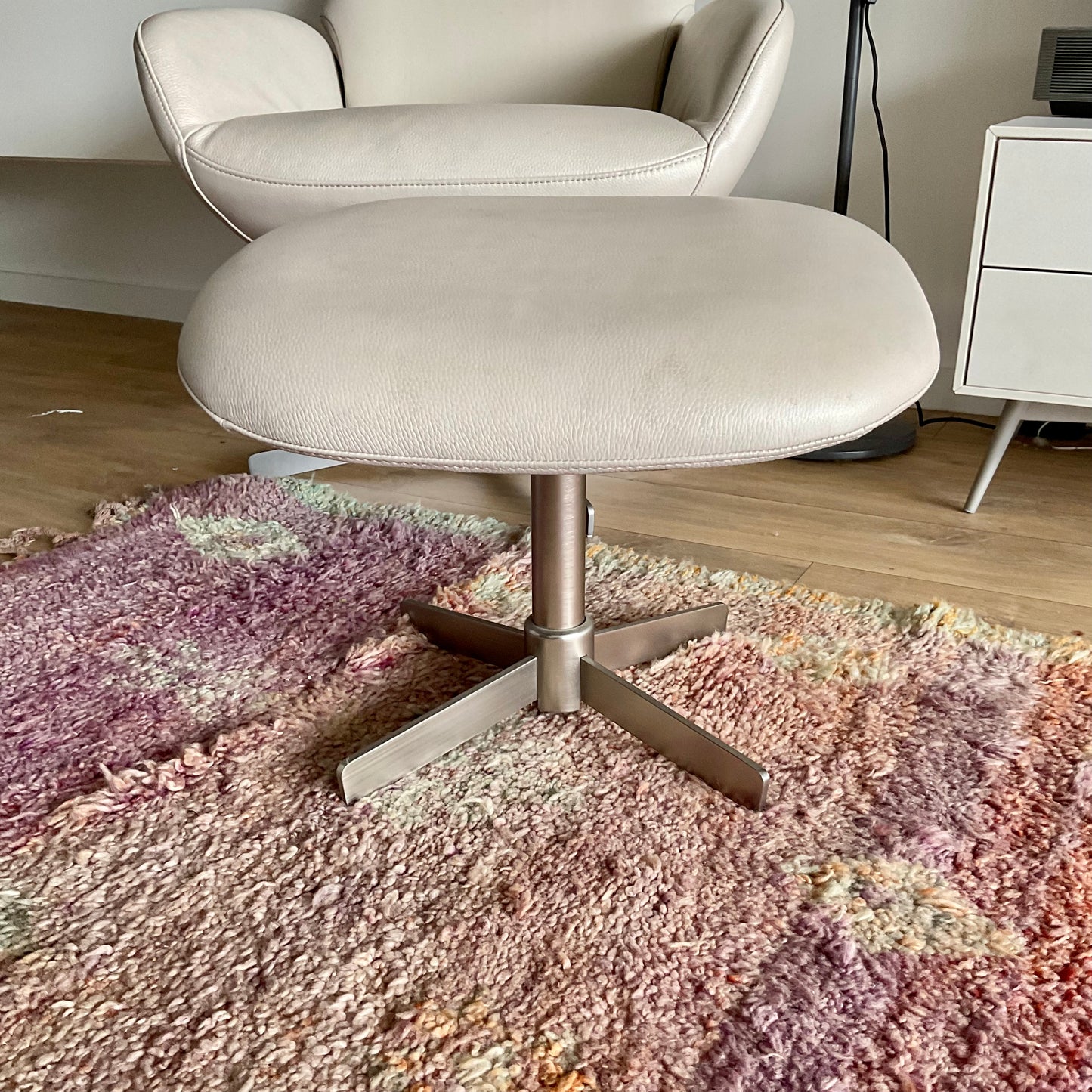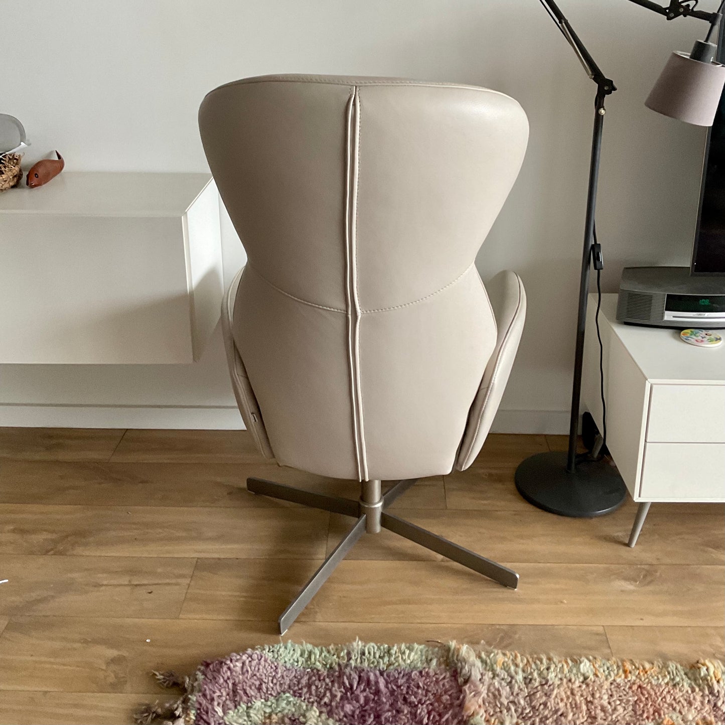 Meet Athena. A private escape. Striking beauty, hugging shapes and a seating comfort out of this world – that is the essence of the Athena recliner chair. Inviting you in with its soft flowing lines and feminine appearance, this modern recliner chair is dressed to impress. Fitted with a swivel base that turns this chair so seamlessly, you’ll want to take it for a spin. The chair and footstool we have on offer both swivels and reclines. The chair & footstool is upholstered light grey Salto leather #0967 with brushed steel base.