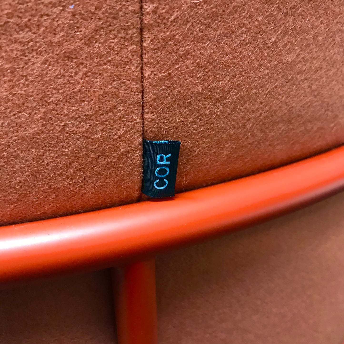 One refined detail is the lacquered steel frame around the upholstered body, which can create exciting highlights with unusual colour combinations. The drop stool we have on offer is in salmon colour.
