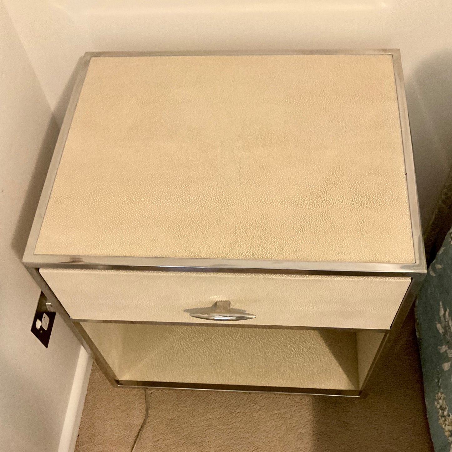 The bedside tables we have on offer have a single pullout drawer with shelf below. The tables have a polished metal frame with shagreen wrapped.