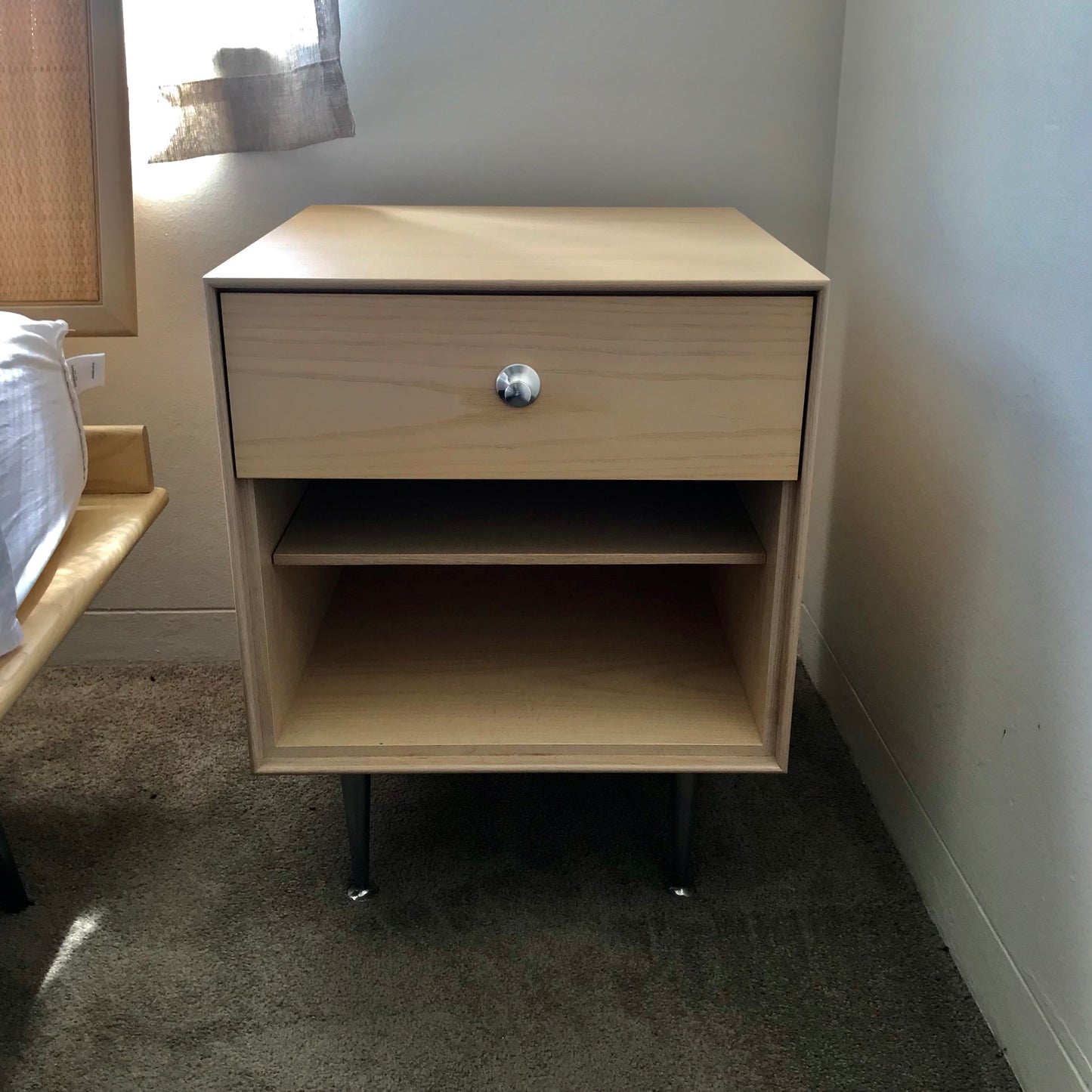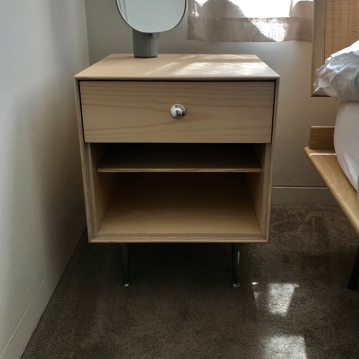 George Nelson’s Thin Edge Collection (1952) was first called the Rosewood Case Series. Manufactured today with environmentally sustainable veneers and 85% recycled materials, Thin Edge leverages the latest manufacturing technologies without compromising the design’s original look and feel. This is the authentic Thin Edge Bedside Table by Herman Miller. The bedside tables we have on offer are in white ash.
