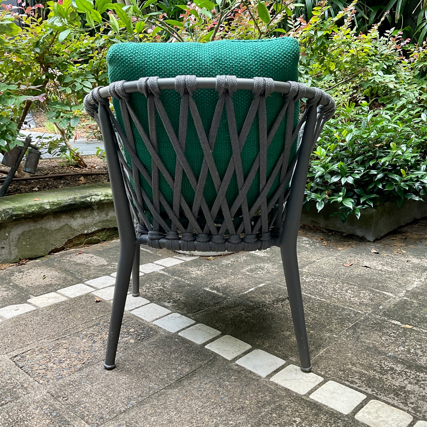 Designed with a technological blend of extruded and die-cast aluminium elements, the Erica chairs are offered in different versions, including a stackable one, and with two types of interlacing. The refined colour combinations include a wide range of finishes for the frames to match the different colours of the interlacing, made of polypropylene ribbons. The seat cushions, embellished with a decorative profile, guarantee comfortable relaxation. The lightness and the design make Erica ideal for both public and residential settings. The chairs we have on offer have a tropical fabric seat cushion and green back cushion.