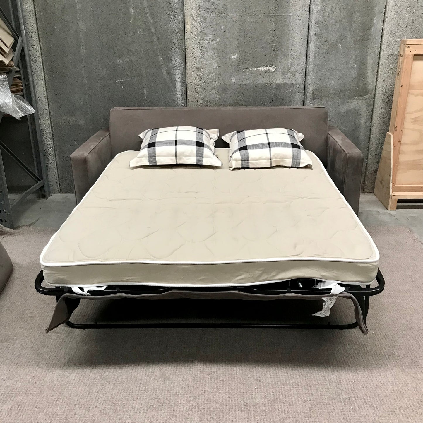 The sofa bed we have on offer is upholstered in ultrasuede. Imported from the USA, the sofabed has a sturdy steel-weave foldout bed. The mattress is 1500 W x 1800 D