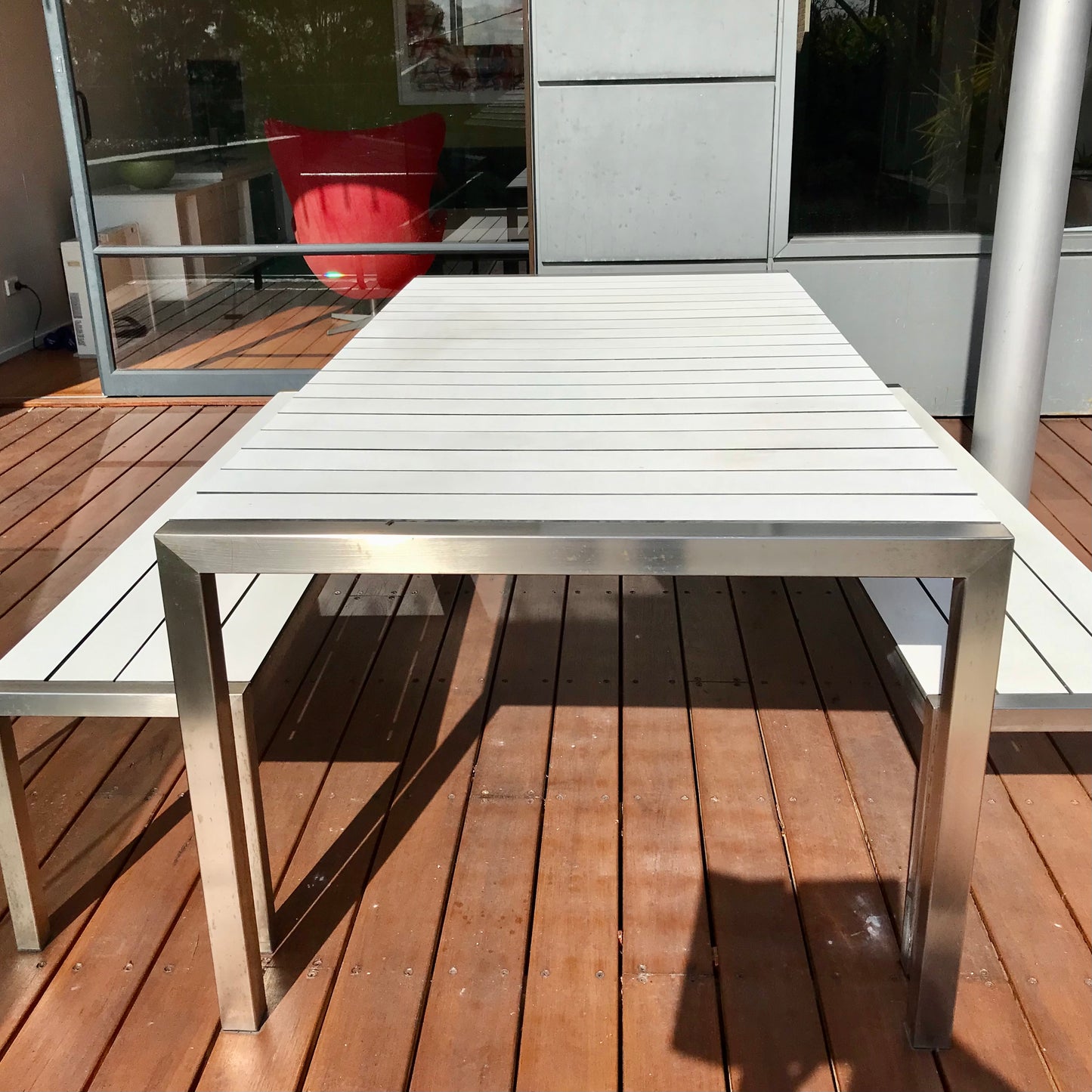 The Soho table and benches we have on offer have a stainless frame with white laminate slats.