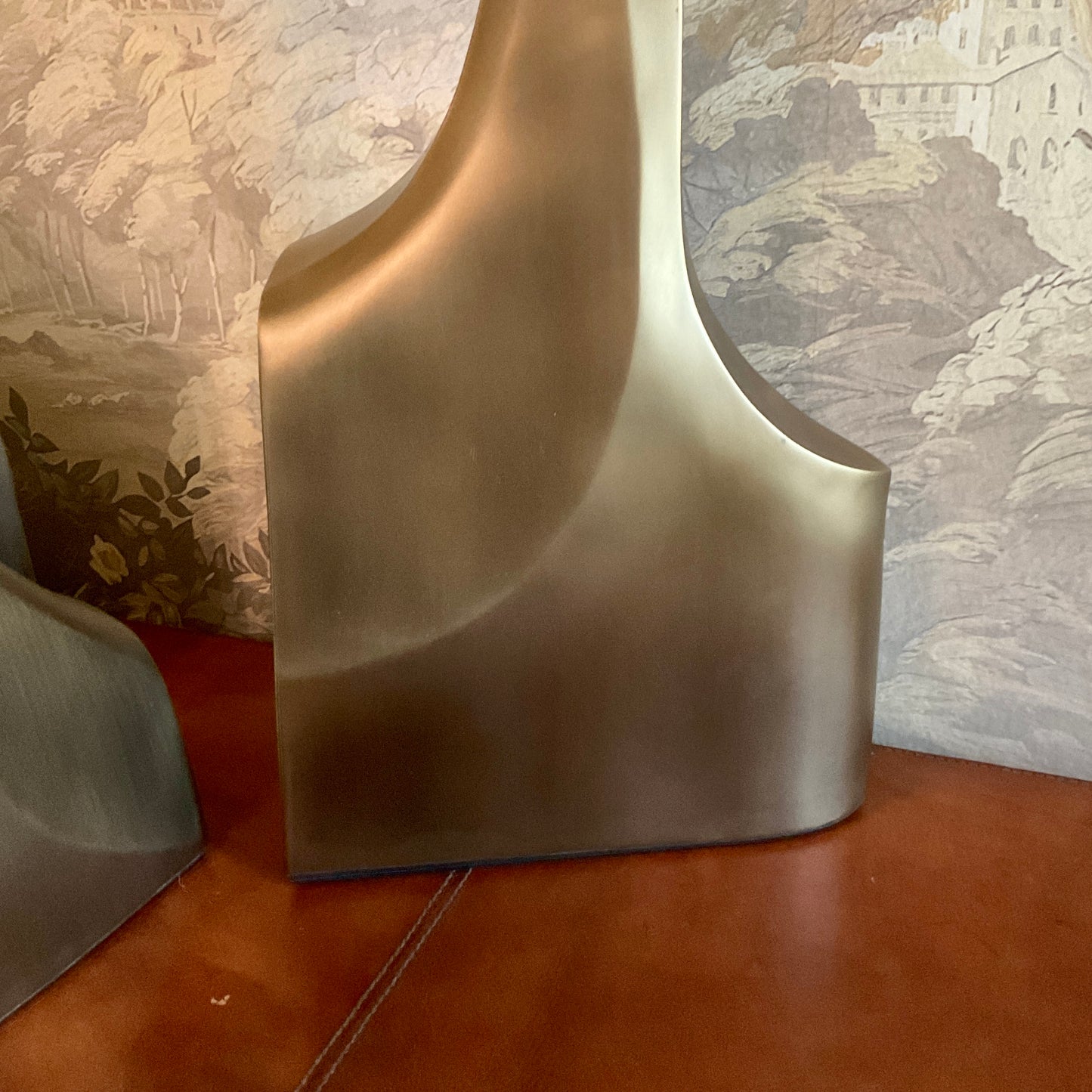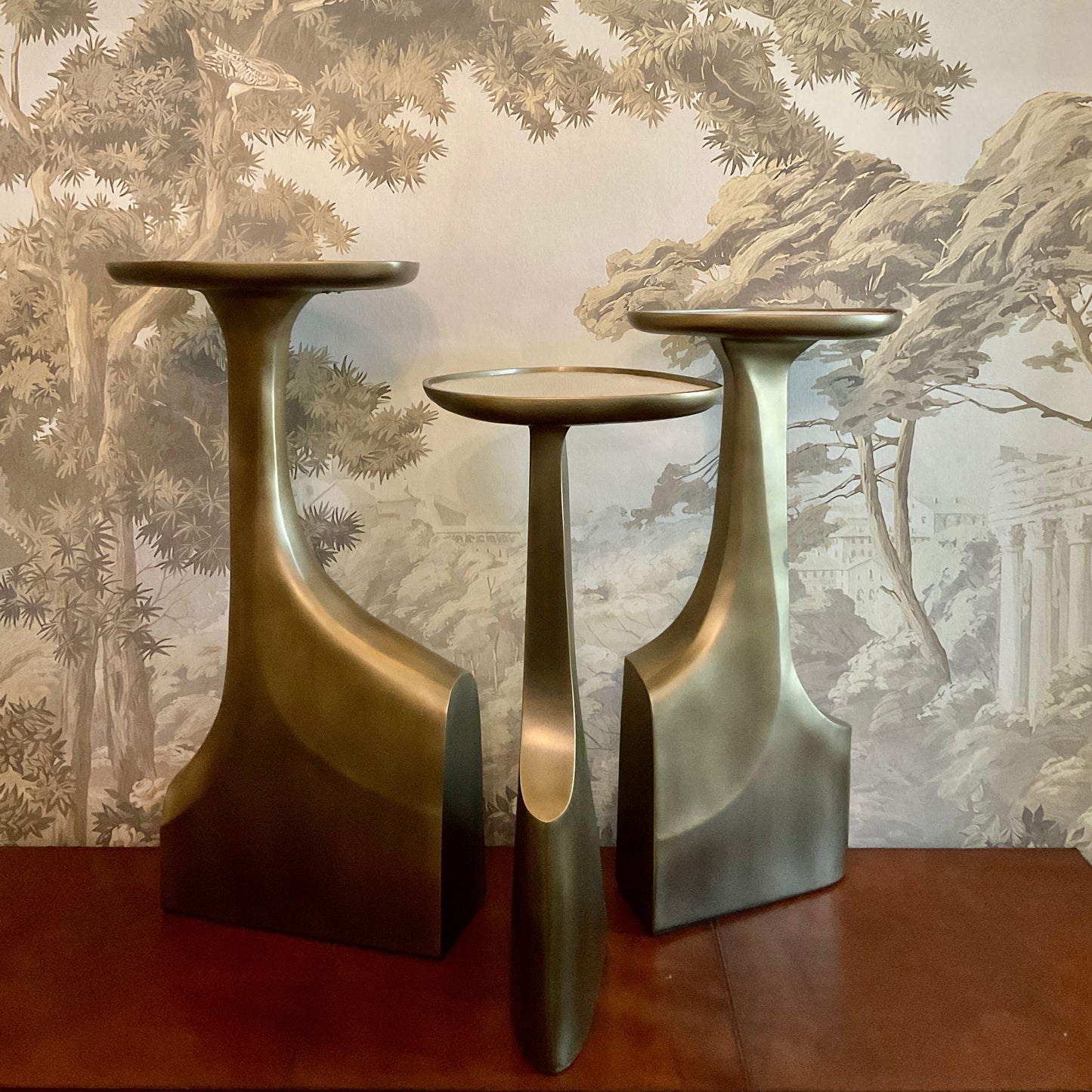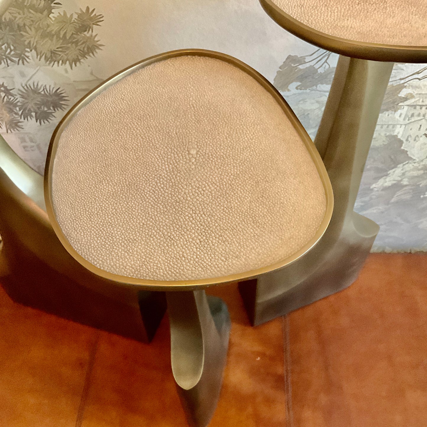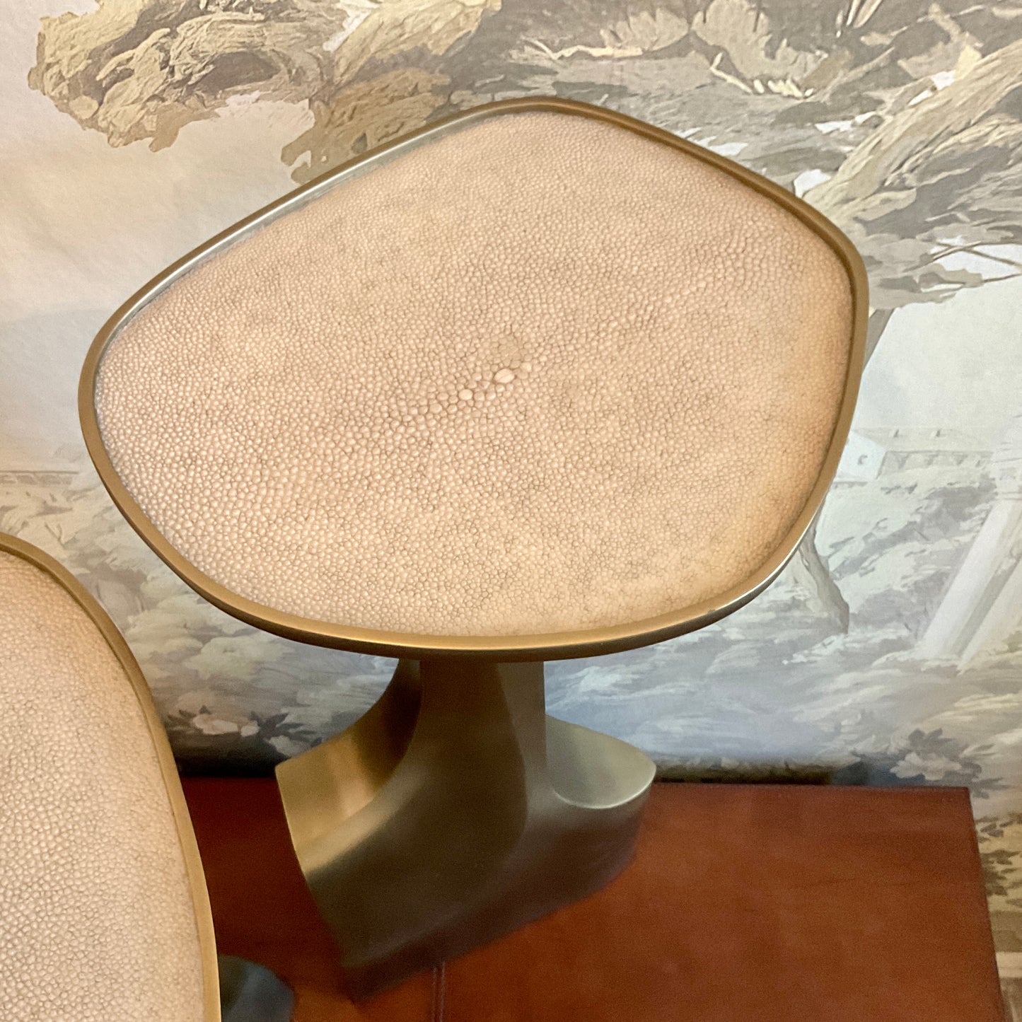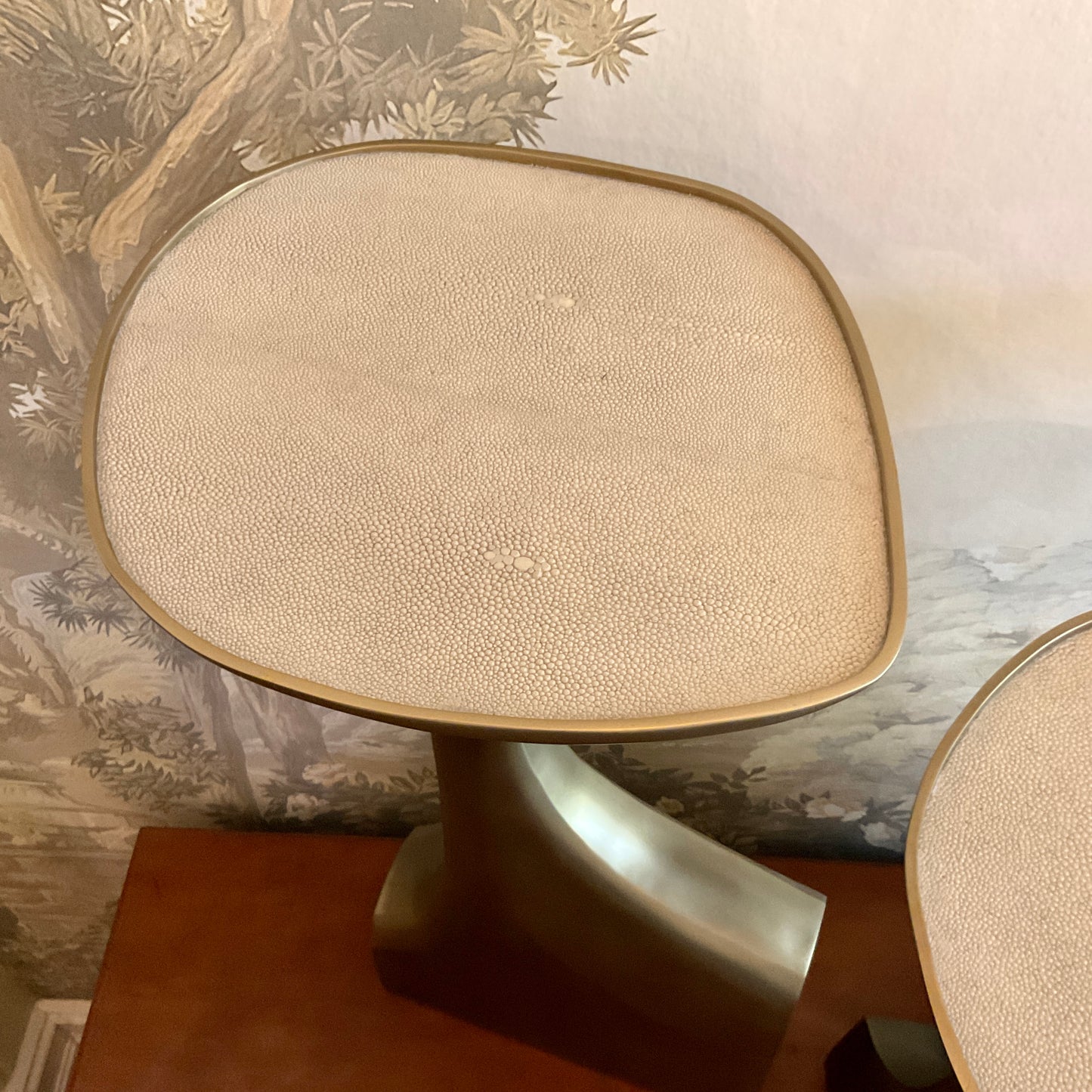The triptych shagreen side tables by R & Y Augousti are multifaceted sculptural pieces. The beautiful hand carved details on the bronze-patina base can join up to each piece differently to create different compositions for your interior. The tops are slightly inset and are inlaid in cream shagreen. All R&Y Augousti pieces are handmade by artisans, ultimately making each piece unique. Acclaimed design duo Ria & Yiouri Augousti have established themselves since the 1990’s as pioneers of modern-vintage style through their luxurious art-deco inspired collections. The Paris based label has distinguished themselves since their launch, with their iconic use of shagreen mixed with brass and other exotic materials. All furniture is handcrafted by skilled artisans, ultimately making each piece unique.