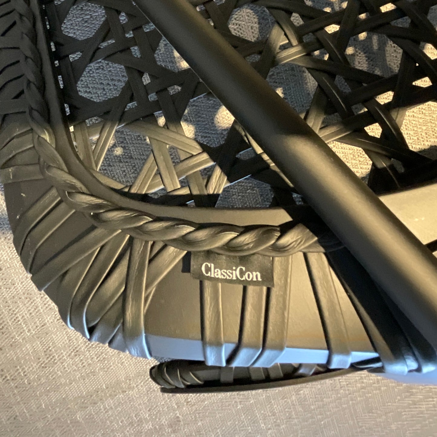 As a chair or lounge chair, Aërias is an adaptable companion in private or public spaces. It is also suitable as an attractive stand-alone piece, with its leather weaving casting interesting shadows on its environment. Chair Frame in tubular steel, powder-coated in black (RAL 9005). Seat and backrest frame moulded wood, black lacquered, covered with weaving made of reinforced leather straps.