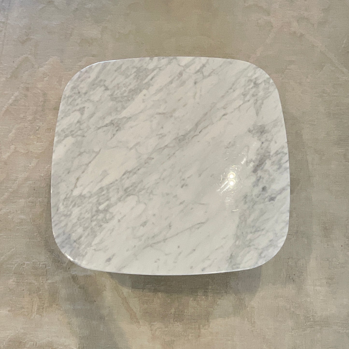 Handcrafted from smooth Carrara marble, this refined mod-ish coffee table infuses glamour into any living space. The simple, minimal central pedestal is made of Epoxy white lacquered steel, while the table top is made of 20mm-thick light grey-veined white Carrara marble, with a beautifully bevelled edge. The marble is protected against certain types of stains with a water-repellent treatment.
