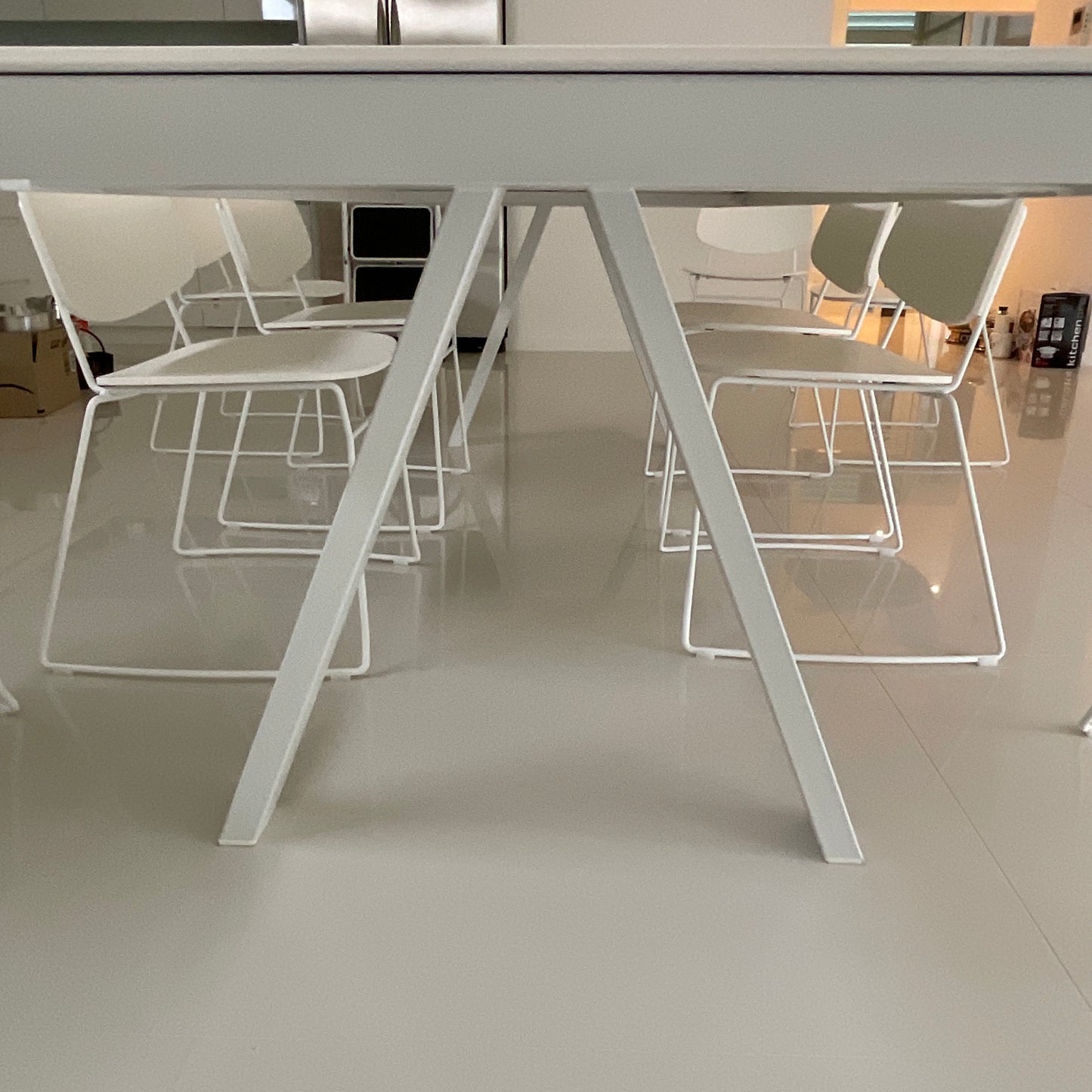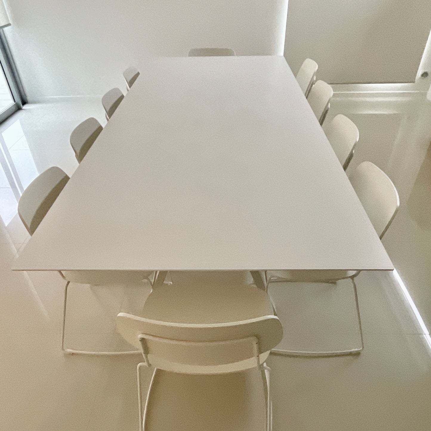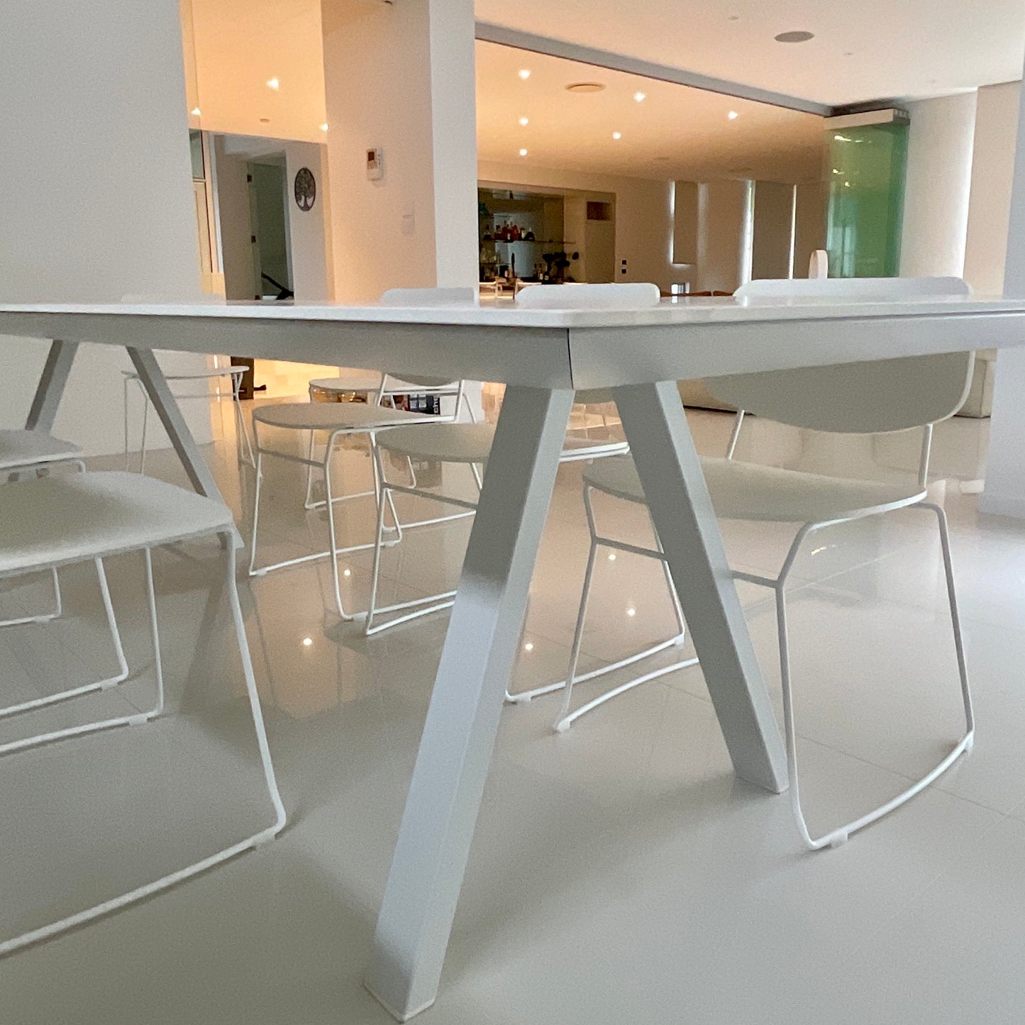 Clean and rigorous in design but versatile in its different applications. Arki-Table has a 6mm solid laminate top, with a frame made of extruded aluminium, and trestle steel legs. Arki-Table is suitable either for meeting, breakout, and dining areas. The table we have on offer is in white.