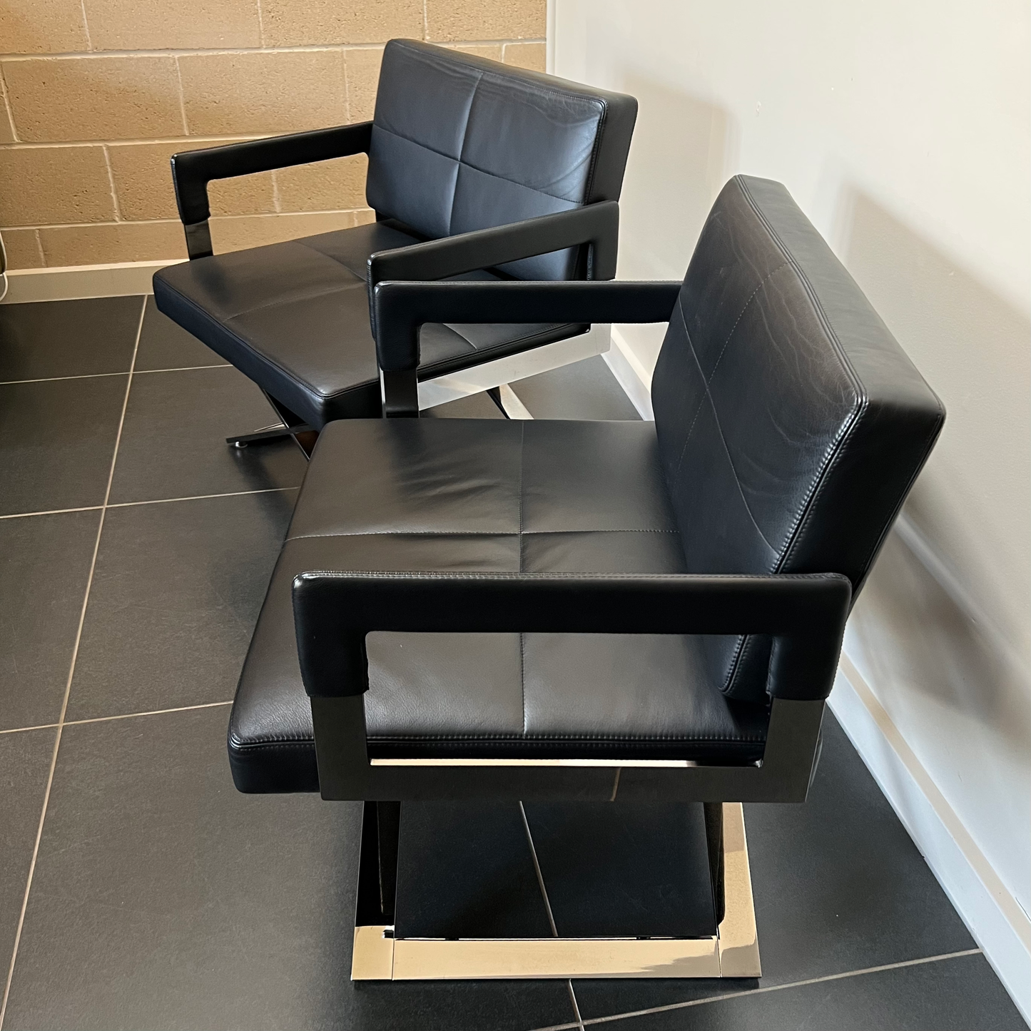 The Aster X armchair, designed by Jean-Marie Massaud, is an ironic and sophisticated take on the classic director’s chair. A simple, linear, X-shaped base supports the elegant and minimalist seat. The Aster X collection is completed by a pouffe and a table, both of which have an X-shaped base. Finally, there is also a variant of the chair in which the feet are the natural extension of the two armrests. While maintaining the characteristic geometrical linearity of the other elements, it does not have an X-shaped supporting structure. The chairs we have on offer backs and armrest covers are handstitched, high-quality leather (black). The X-shaped legs and frame are made of steel with a Ruthenium finish (like polished chrome).