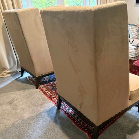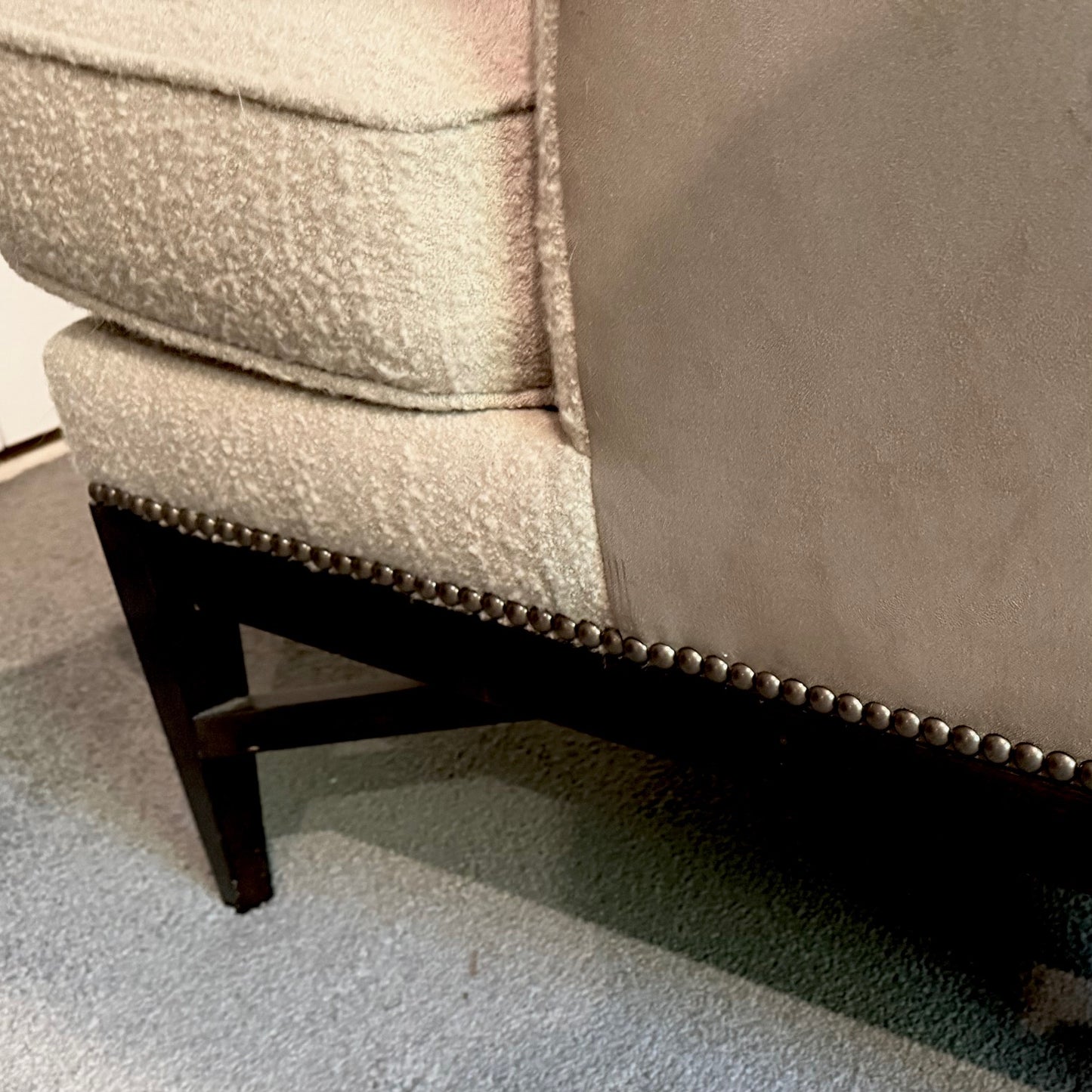 Stately wing chair with tight upholstered back, loose seat cushion atop a tapered show-wood base. The chair we have on offer has a suede outside back and boucle upholstery inside seat and back.