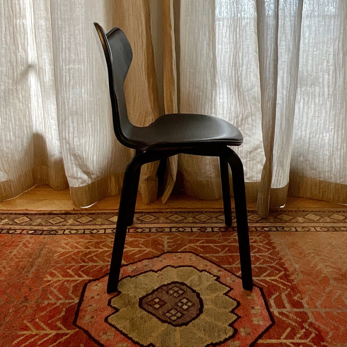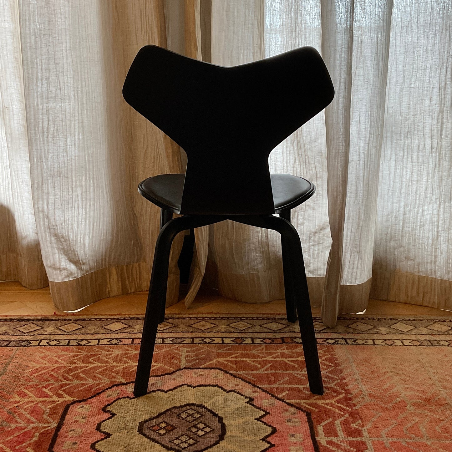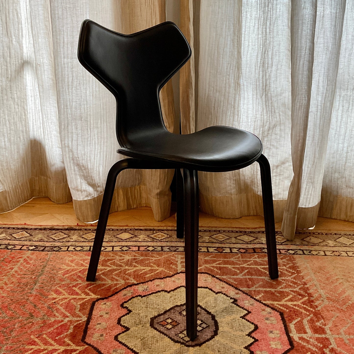 The Grand Prix™ by Arne Jacobsen was introduced by Fritz Hansen at the Designers’ Spring Exhibition at the Danish Museum of Art & Design in Copenhagen, in 1957. Later that year, the chair was displayed at the Triennale in Milan where it received the Grand Prix – the finest distinction of the exhibition. The set of chairs we have on offer have 195 black ash wood base with 5. Grace black leather.