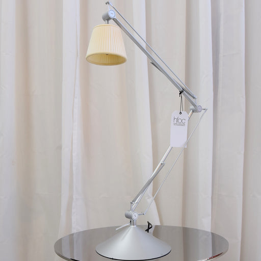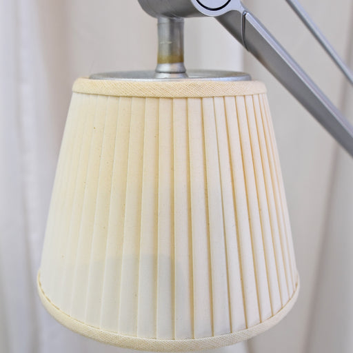 ARCHIMOON SOFT task lamp providing direct and diffused light. Archimoon Soft has a fully articulating silver aluminum arm with heat tempered springs balanced to provide parallel arm movement. Shade always remains horizontal to the work plane. Plisse cloth shade with an internal opal glass diffuser. Lamp (Bulb) 1 x 40W G9 frosted halogen. Dimensions shown are with the lamp at right angle.